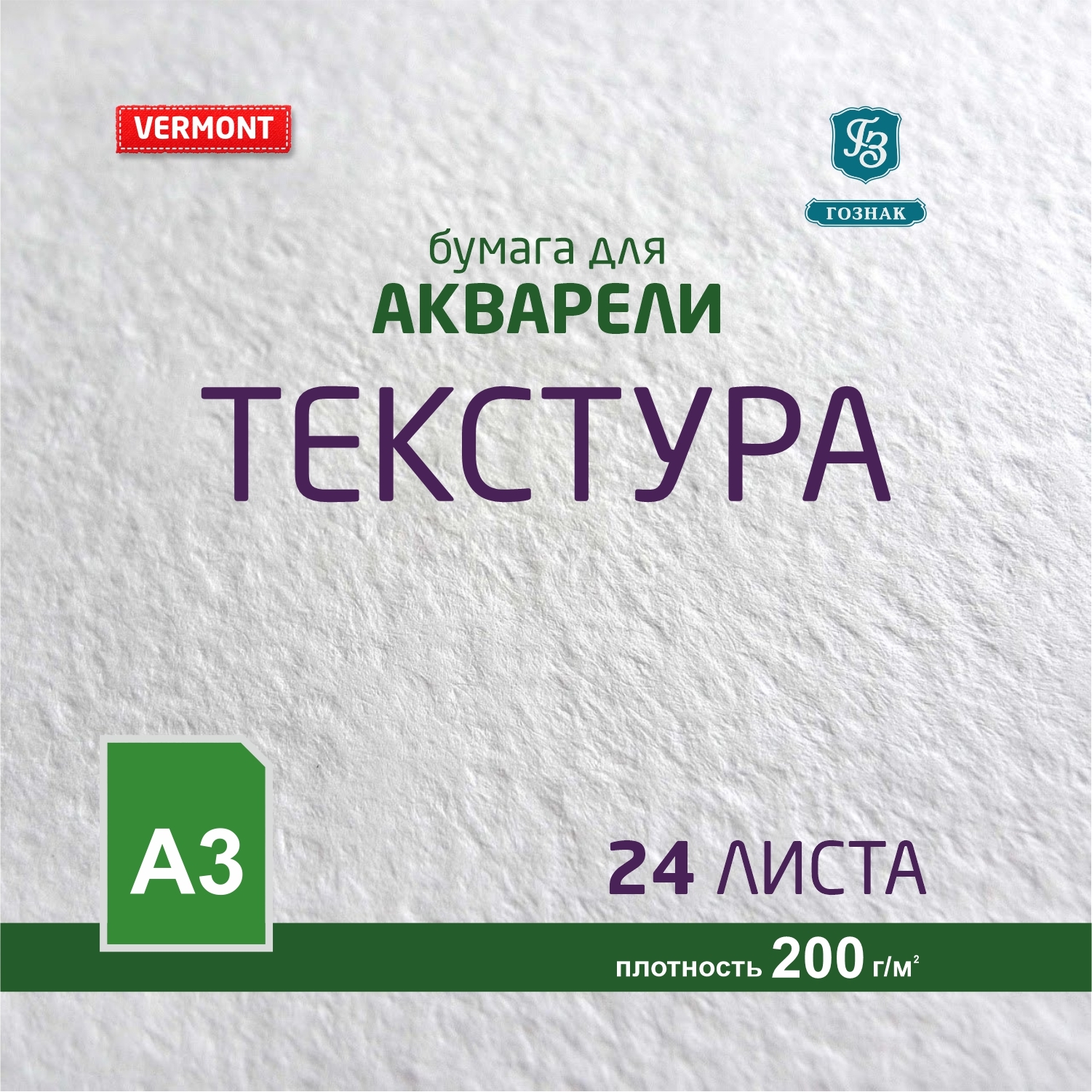 Бумага для рисования VERMONT для акварели 200 г/м2 А3 24 листа ГОЗНАК