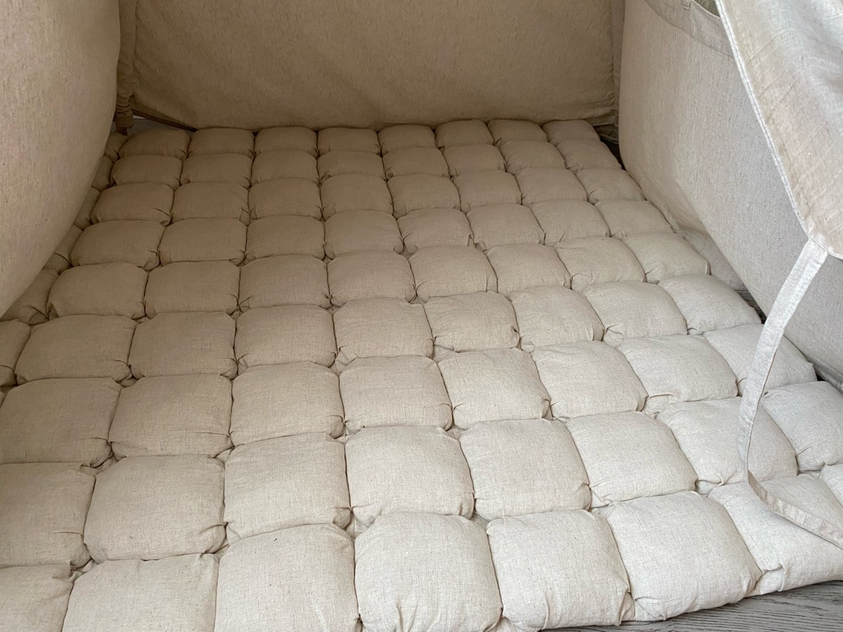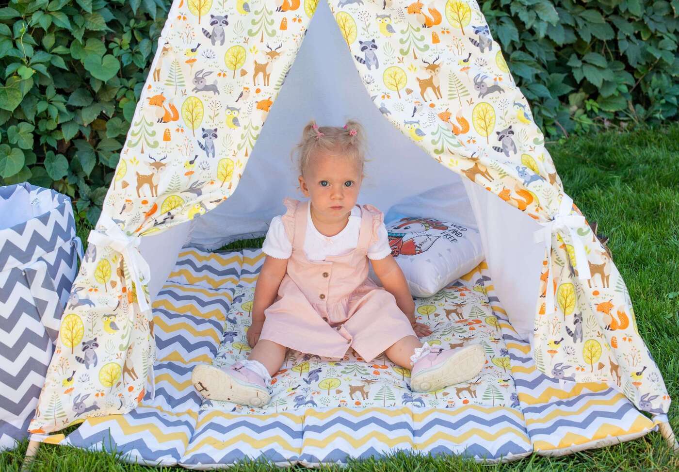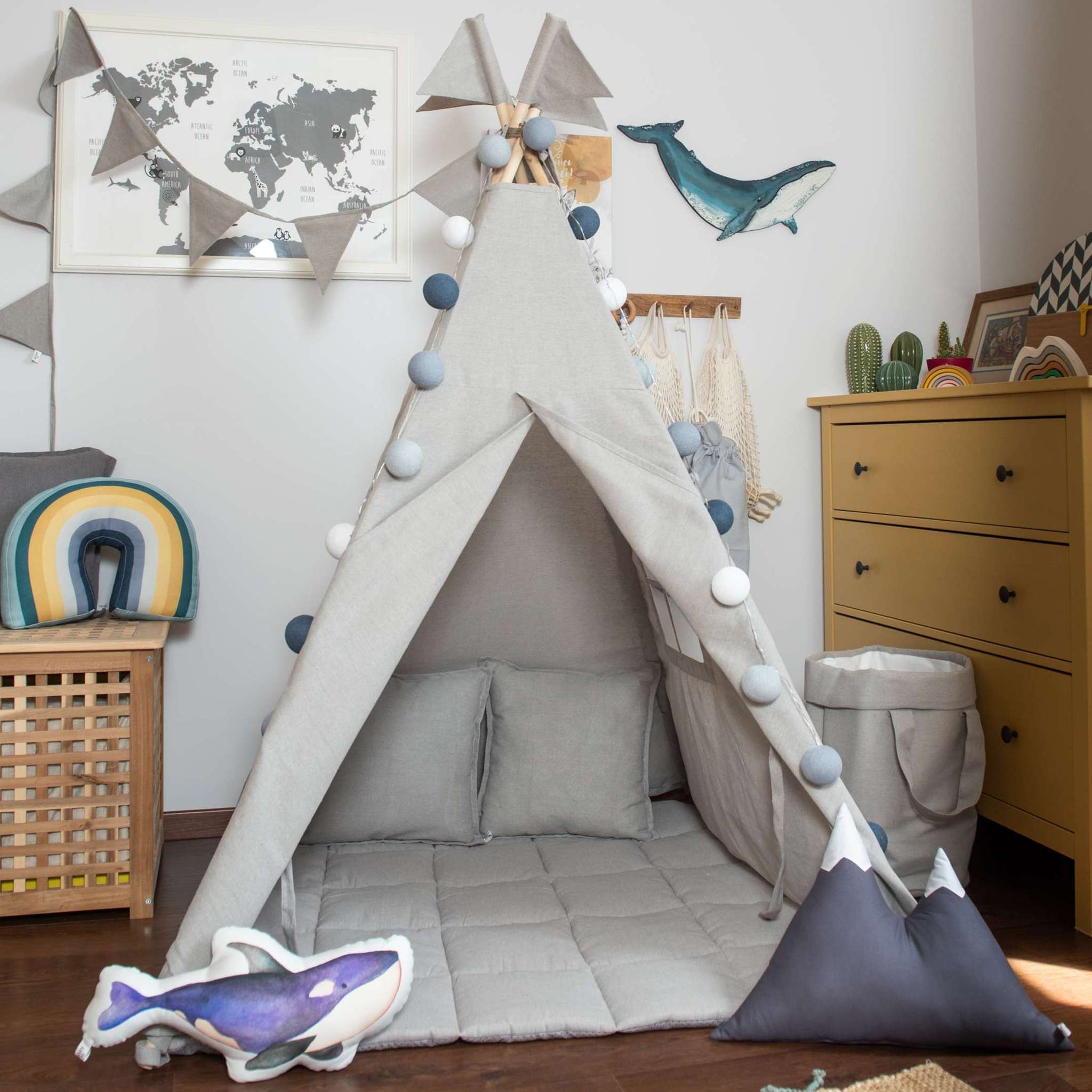 Детский вигвам льняной Vigvam Shop с разборной конструкцией, с матрасиком, флажками, 2 подушками и системой антискладывания 130*130 см