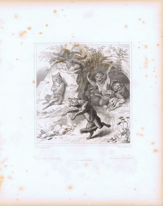 Гравюра Вильгельм фон Каульбах Страшные пещерные обезьяны выгнали волка Изергима. Офорт. Германия, Штутгарт, 1867 год
