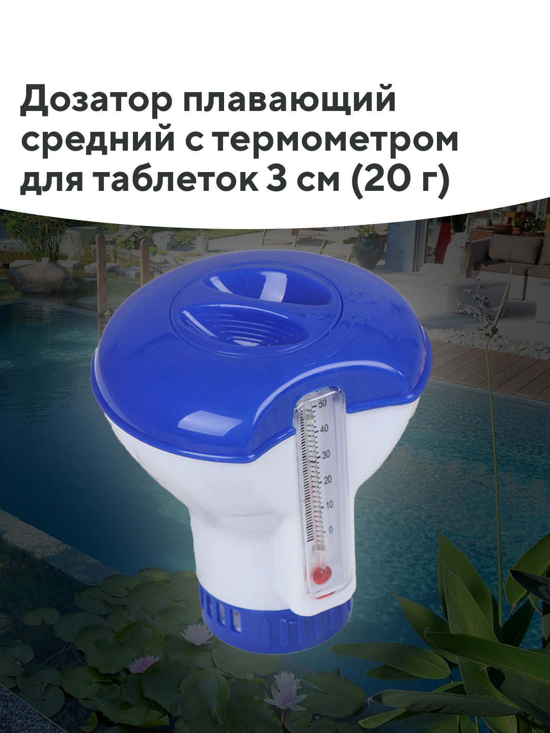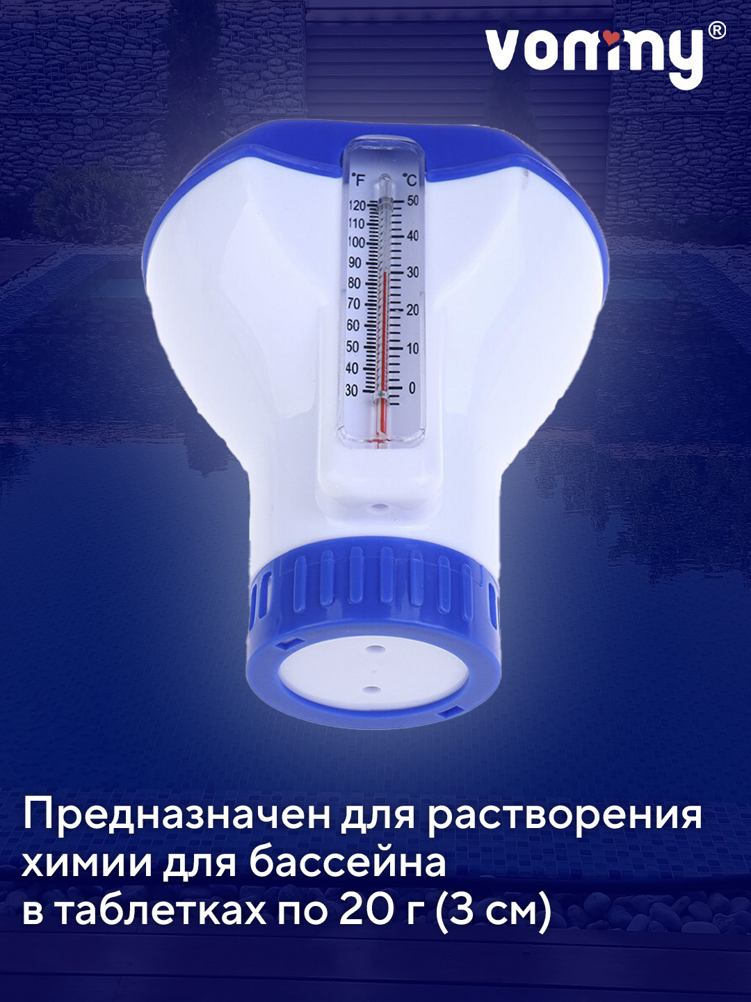 Дозатор с термометром плавающий (поплавок) средний для растворения химии в бассейне Vommy (размер таблеток: 30 мм, 20 г) синий
