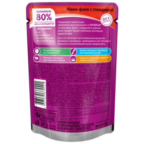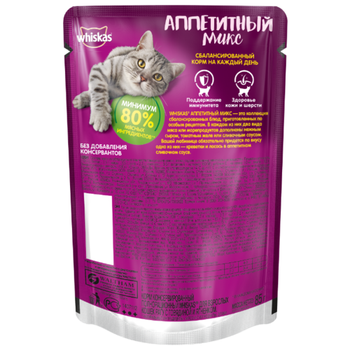 Корм для кошек Whiskas Аппетитный микс для здоровья кожи и шерсти, с говядиной 85 г (кусочки в желе)
