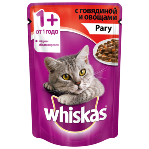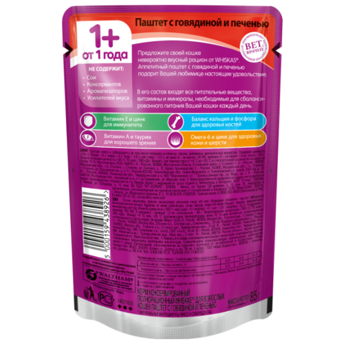 Влажный корм для кошек Whiskas, паштет с говядиной и печенью, 75 г