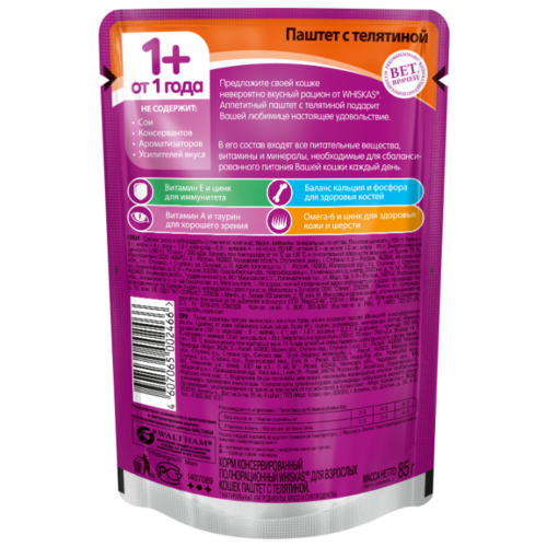 Корм для пожилых кошек Whiskas беззерновой, с телятиной 85 г (паштет)