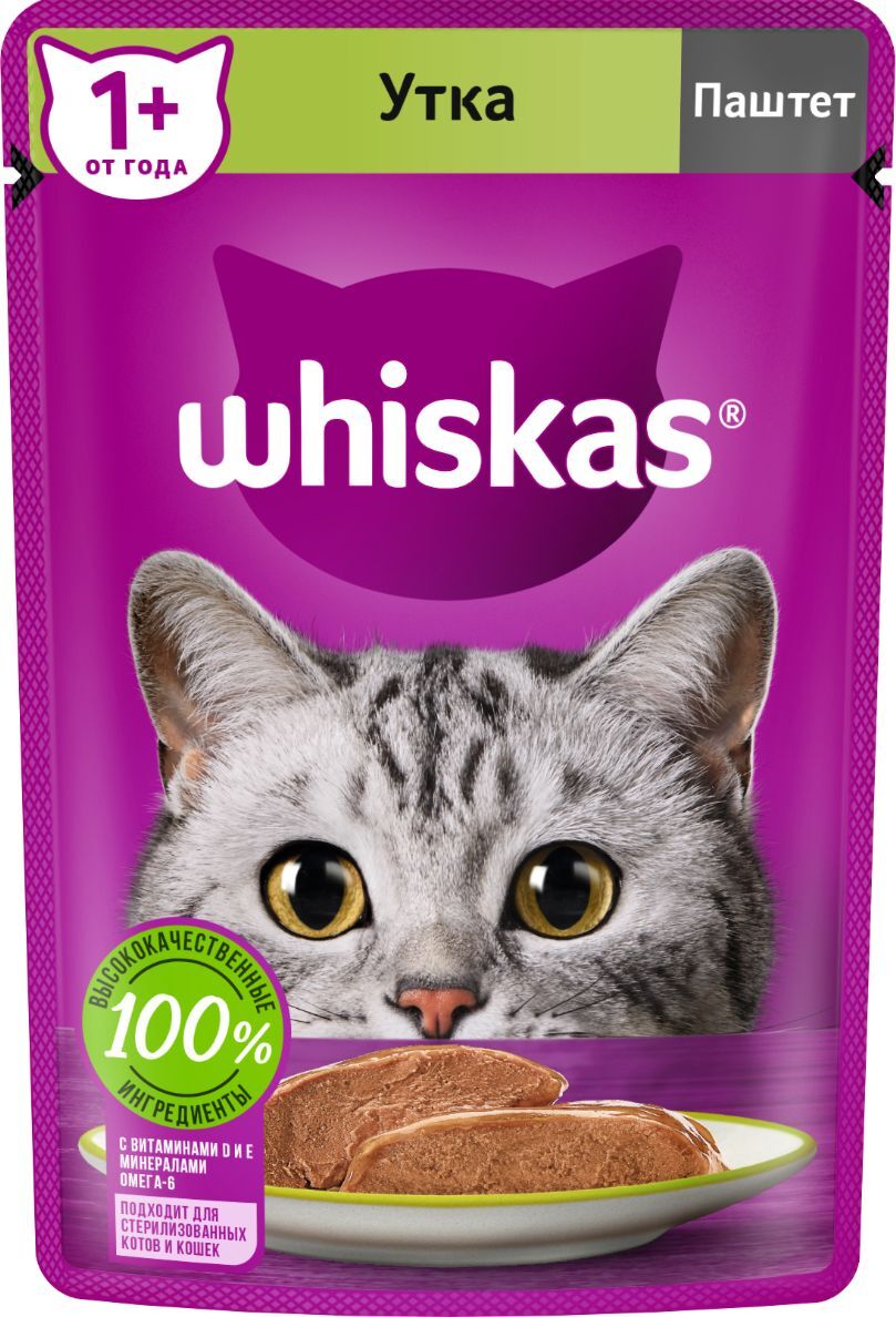 Влажный полнорационный корм WHISKAS для взрослых кошек, паштет с уткой, 75 г
