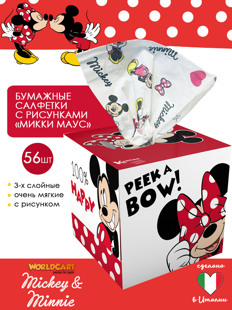 MKN-FC-01/happy Салфетки бумажные выдергушки "Микки Маус" с рисунком 3-х сл, 56 шт, World Cart