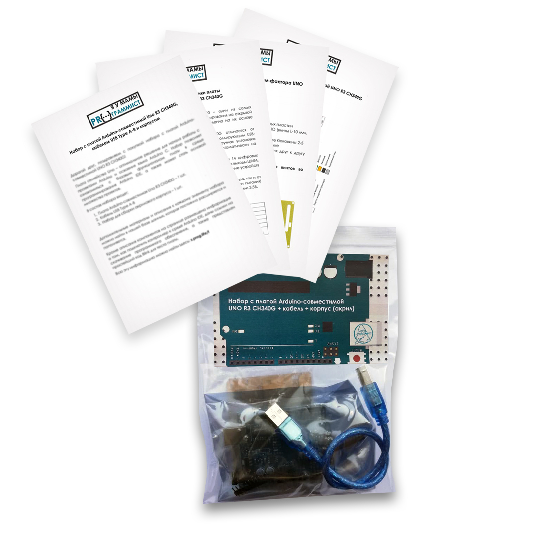Набор с платой Arduino-совместимой Uno R3 CH340G + кабель USB Type A/B + корпус (акрил)