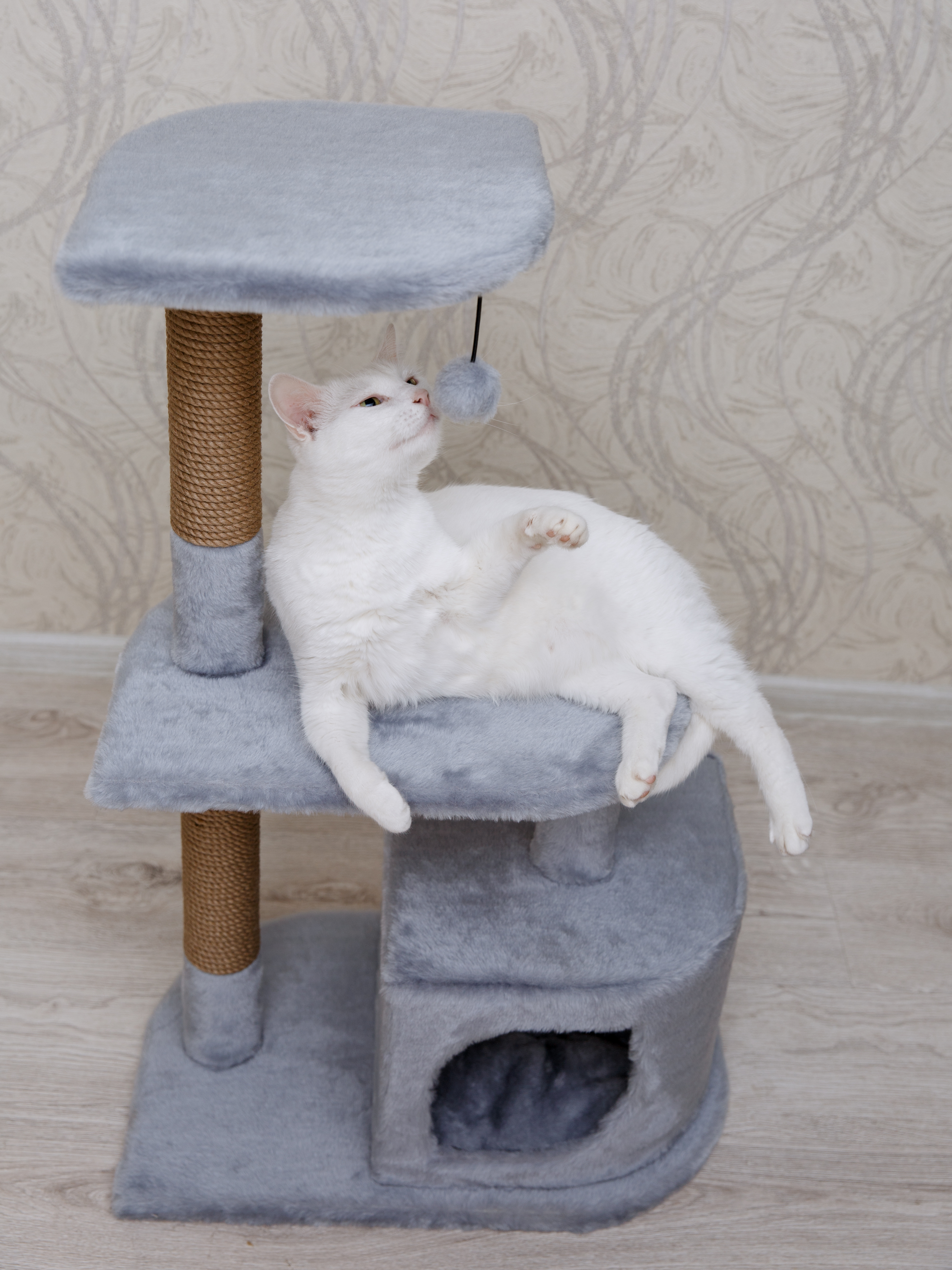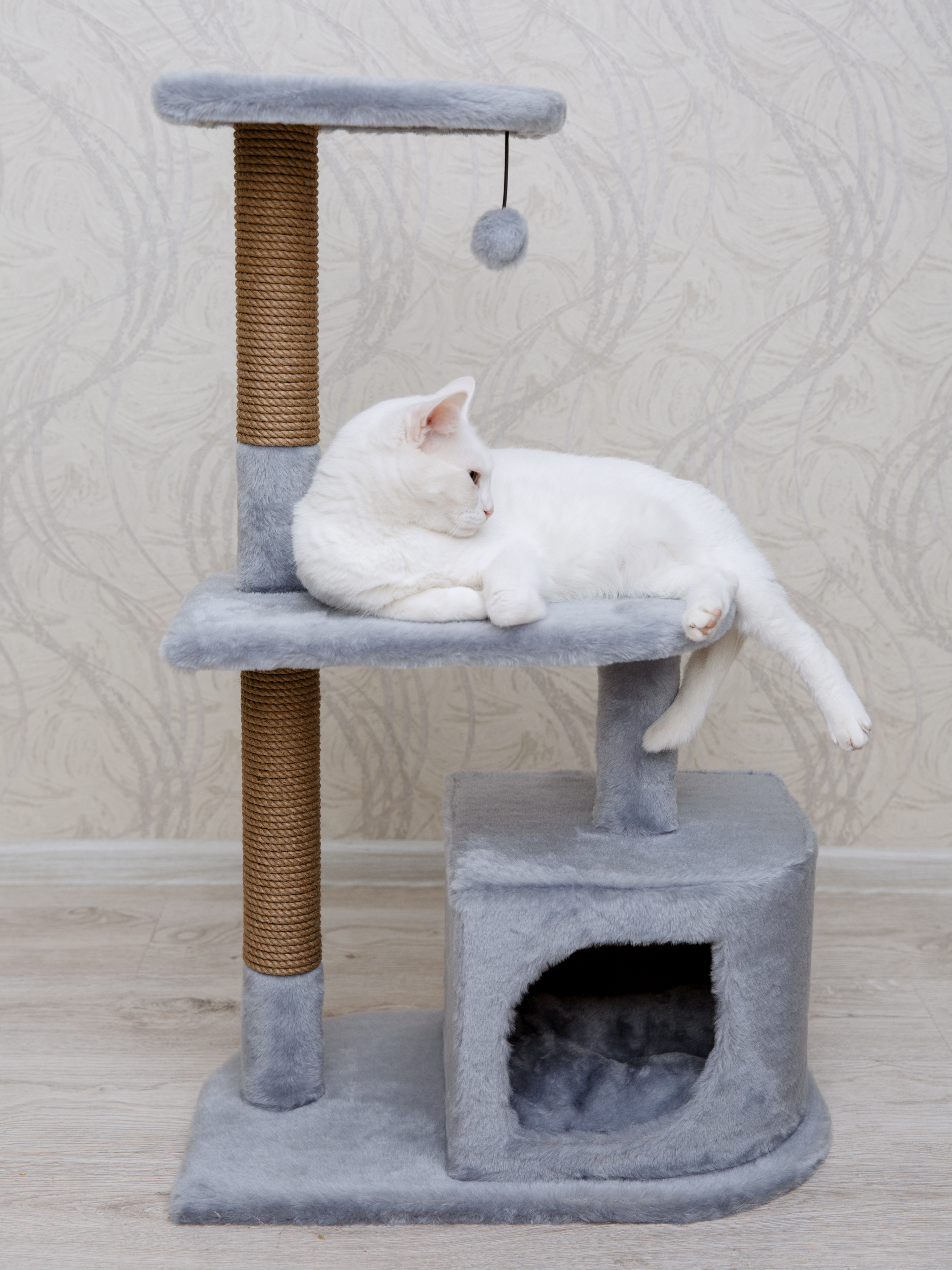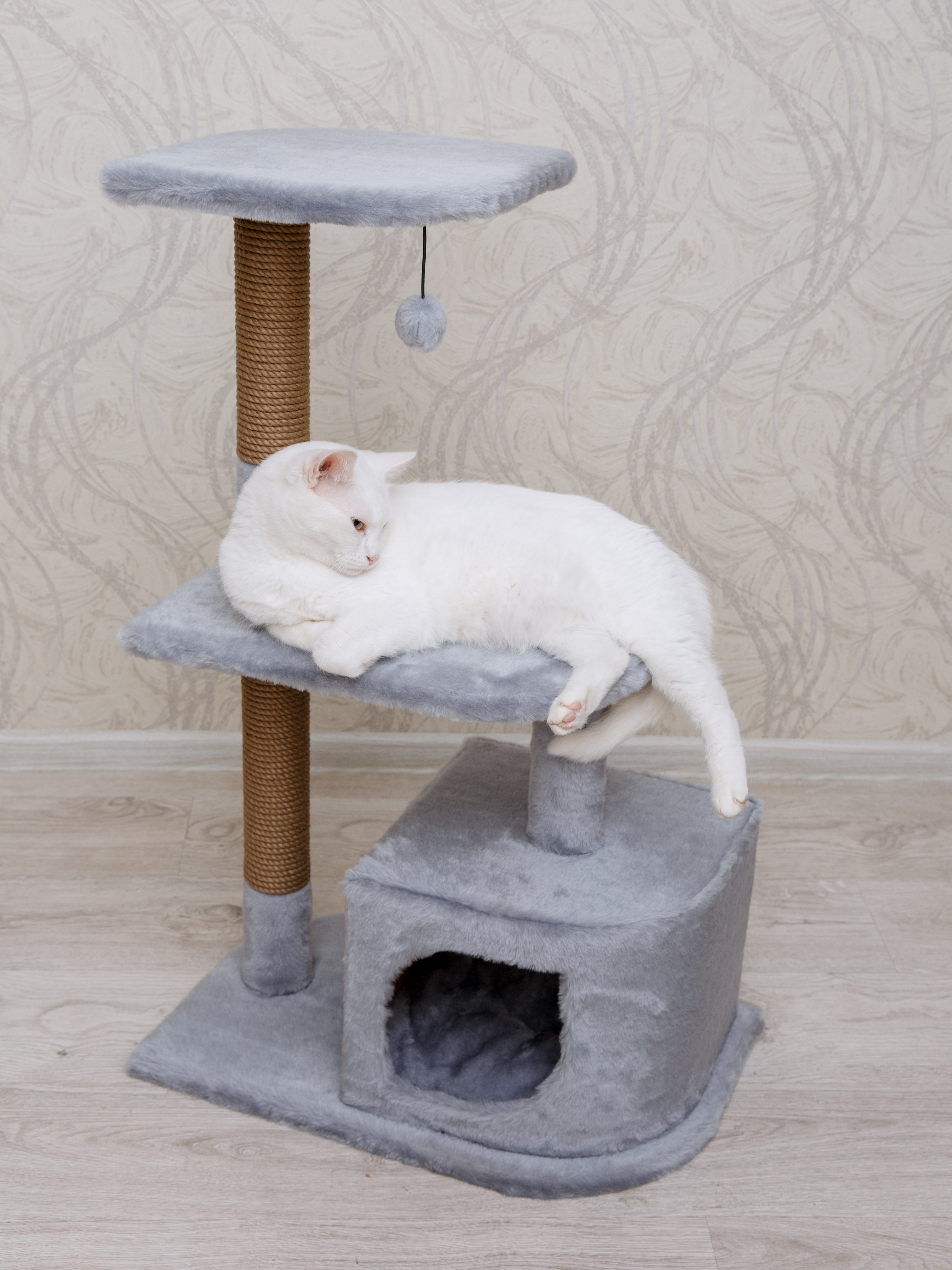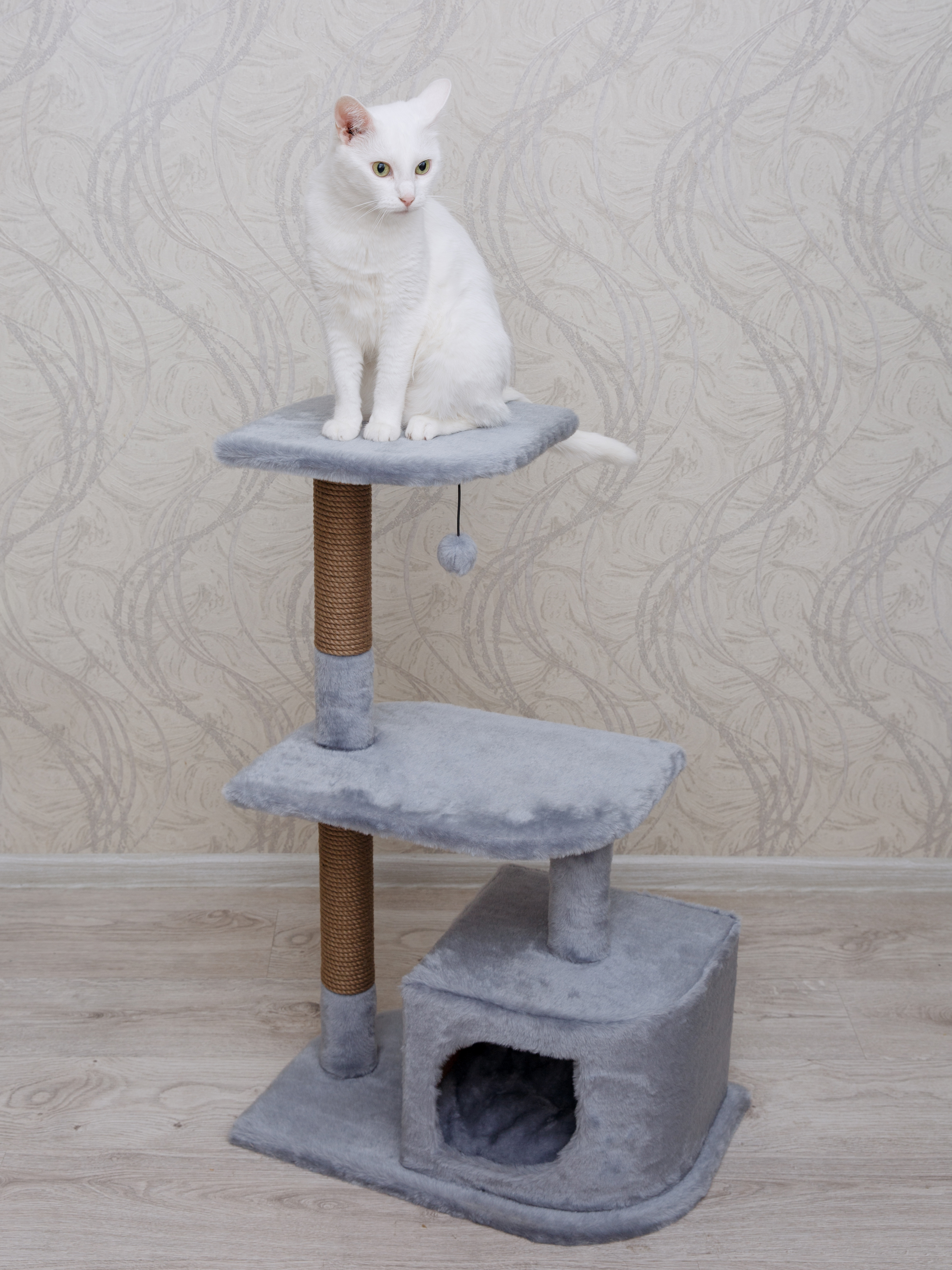 Когтеточка (игровой комплекс) для кошек с домиком, с лежанкой, с игрушкой 56х36х91см, серый, YUGA