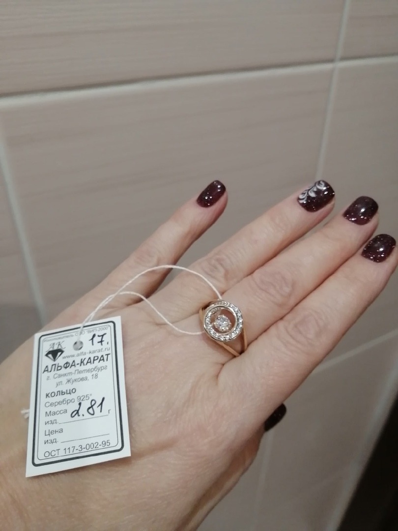Ювелир Карат Кольцо серебряное в позолоте с качающимися фианитами, серебро 925