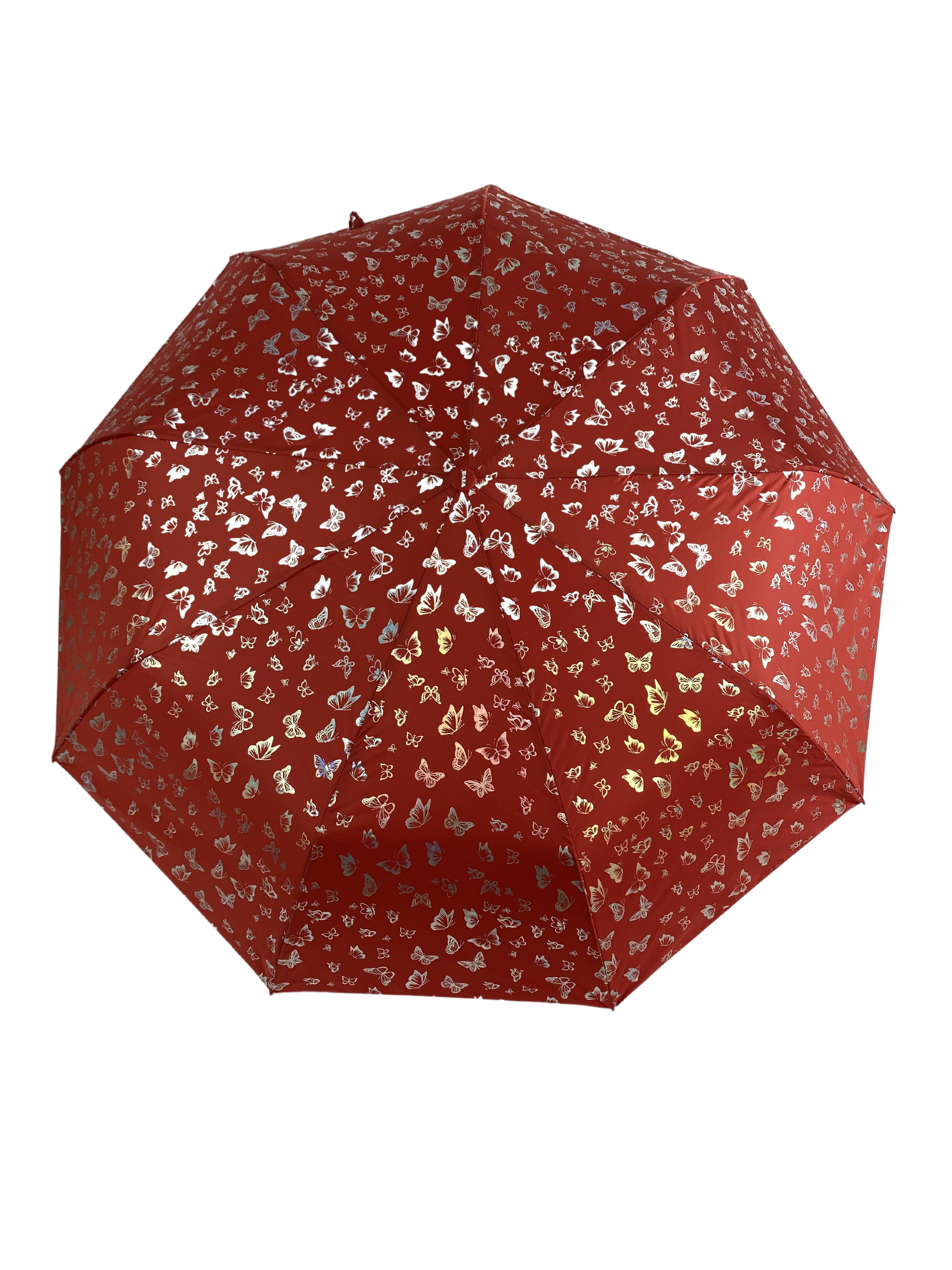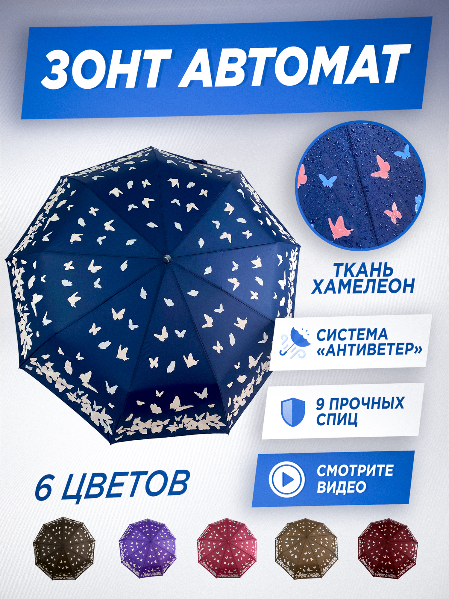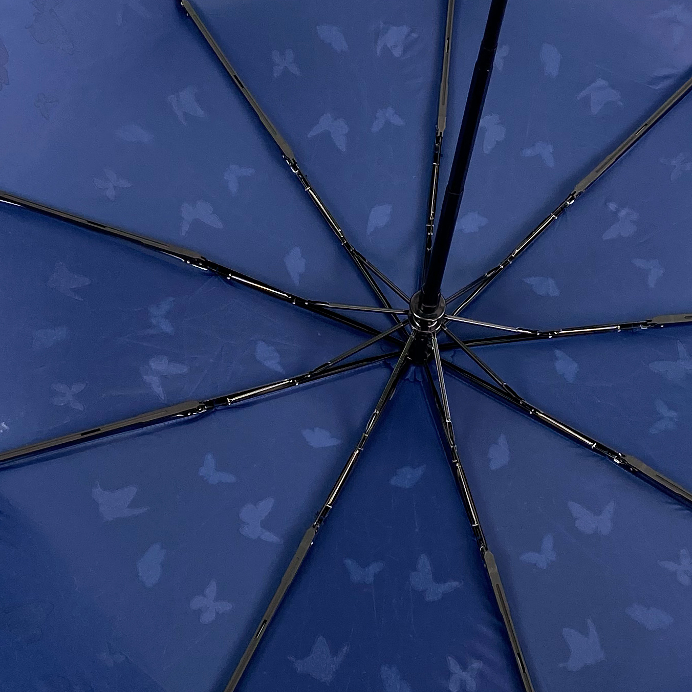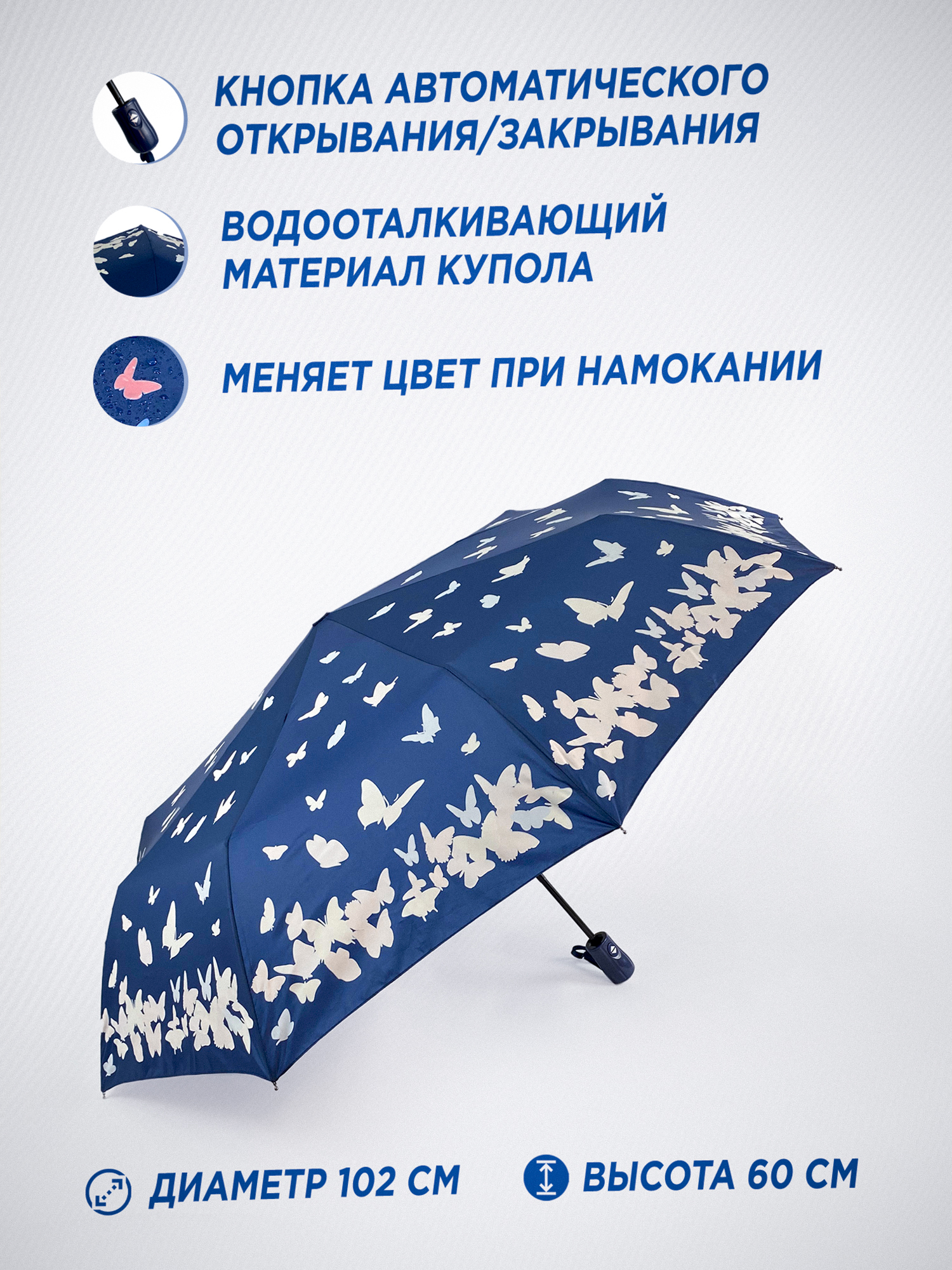 Зонт женский автомат / складной / рисунок переливается / большой купол - 102 см/ 3 сложения / 9 спиц / от солнца от дождя / с бабочками синий
