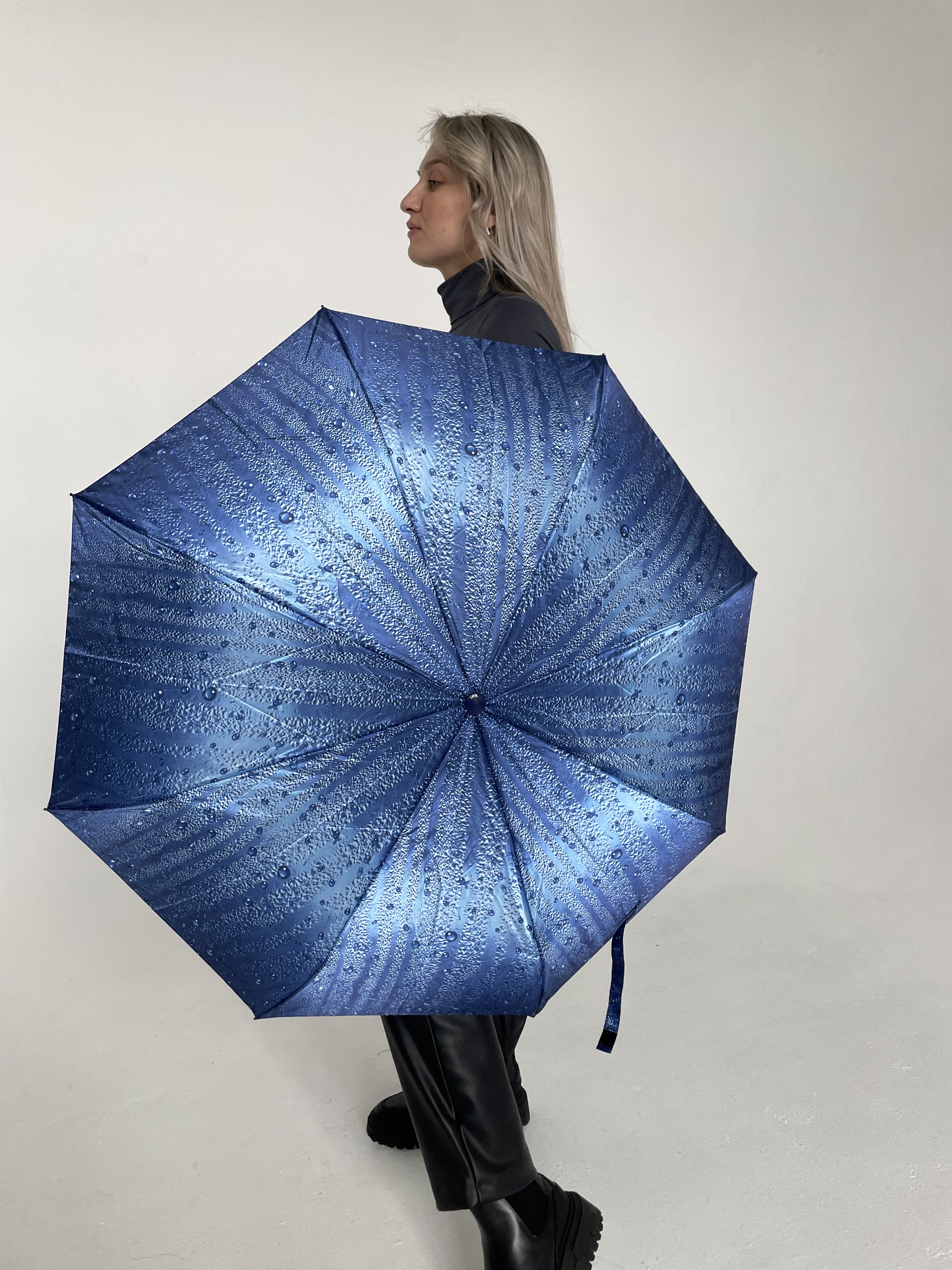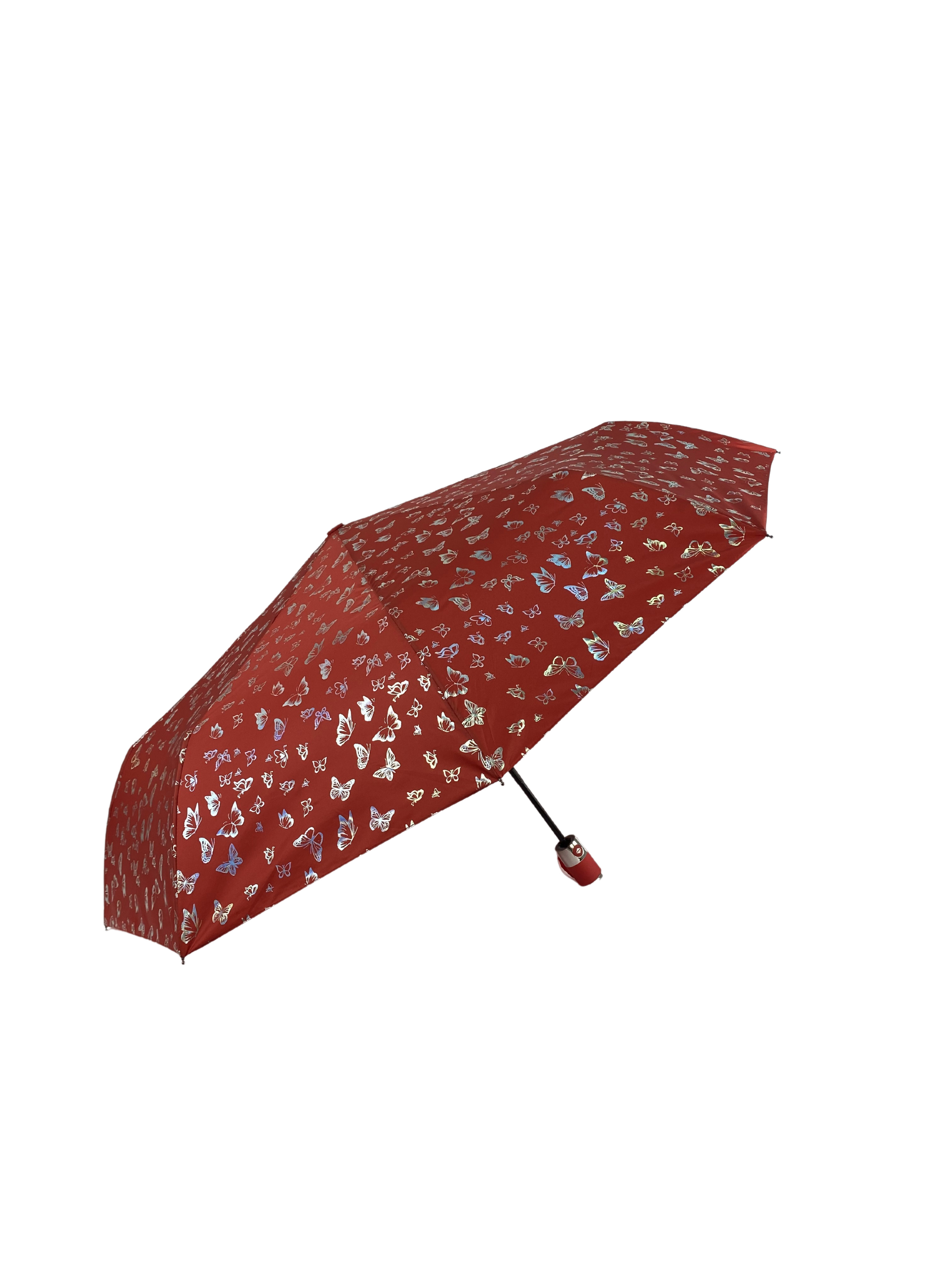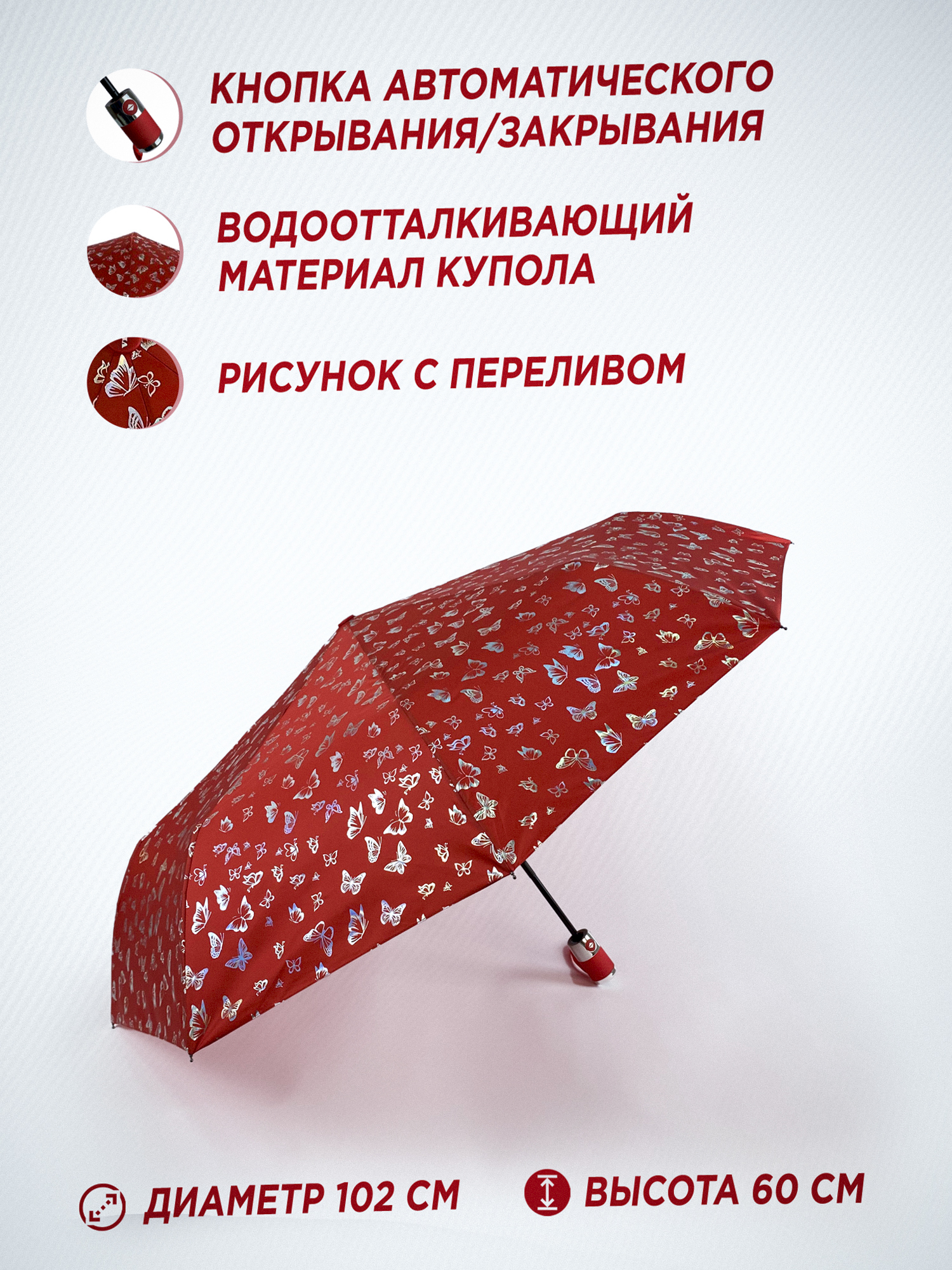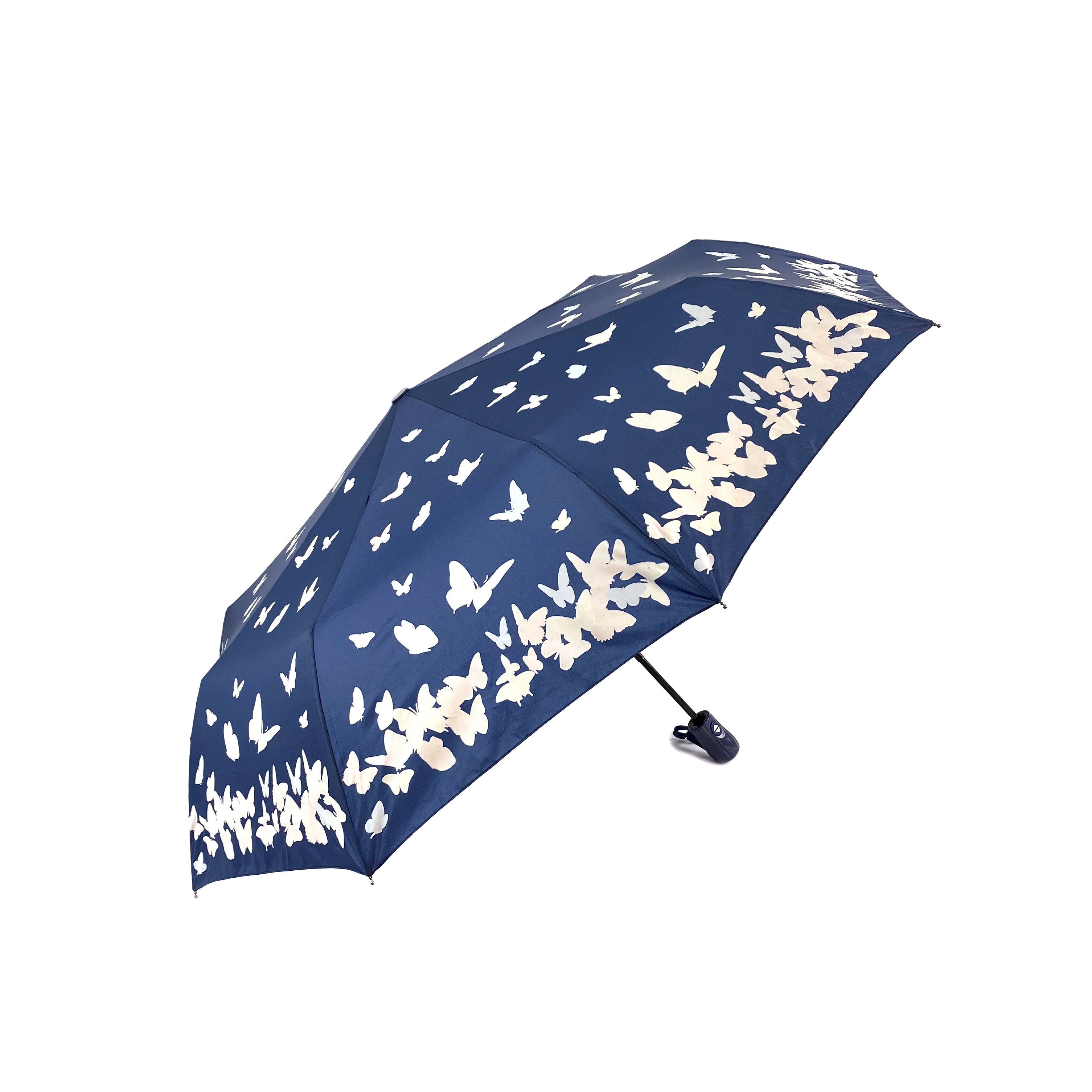 Зонт женский автомат / складной / рисунок переливается / большой купол - 102 см/ 3 сложения / 9 спиц / от солнца от дождя / с бабочками синий