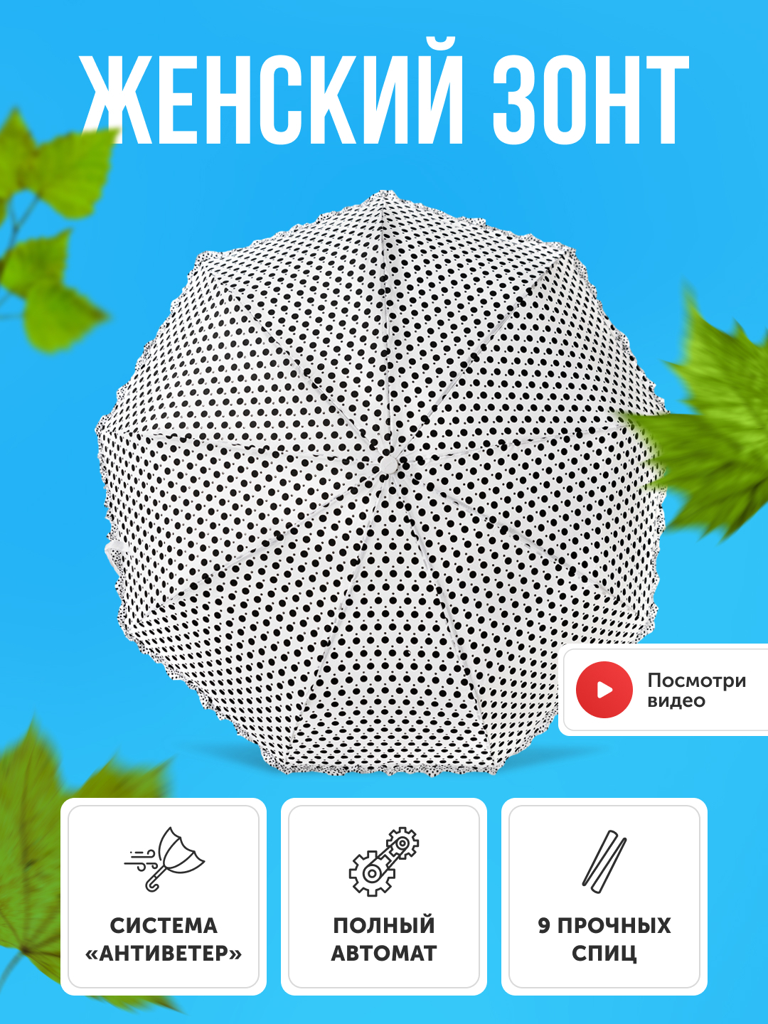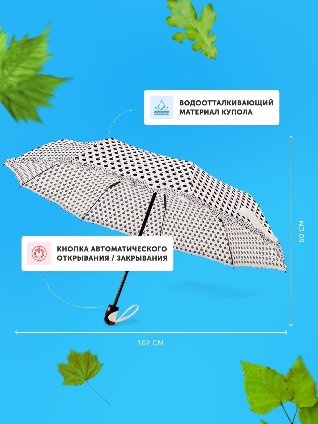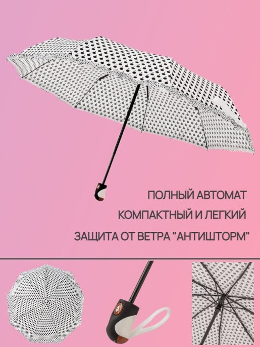 Зонт женский автомат / складной / купол - 102 см/ 3 сложения / 9 спиц / от солнца от дождя/ в горошек
