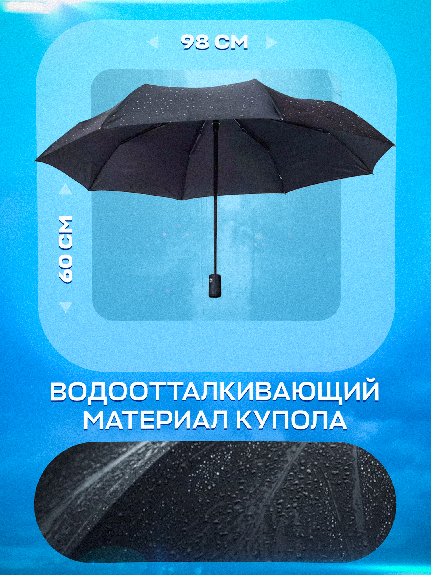 Зонт мужской автомат черный / складной / большой купол - 98 см/ 3 сложения / 9 спиц / от солнца от дождя