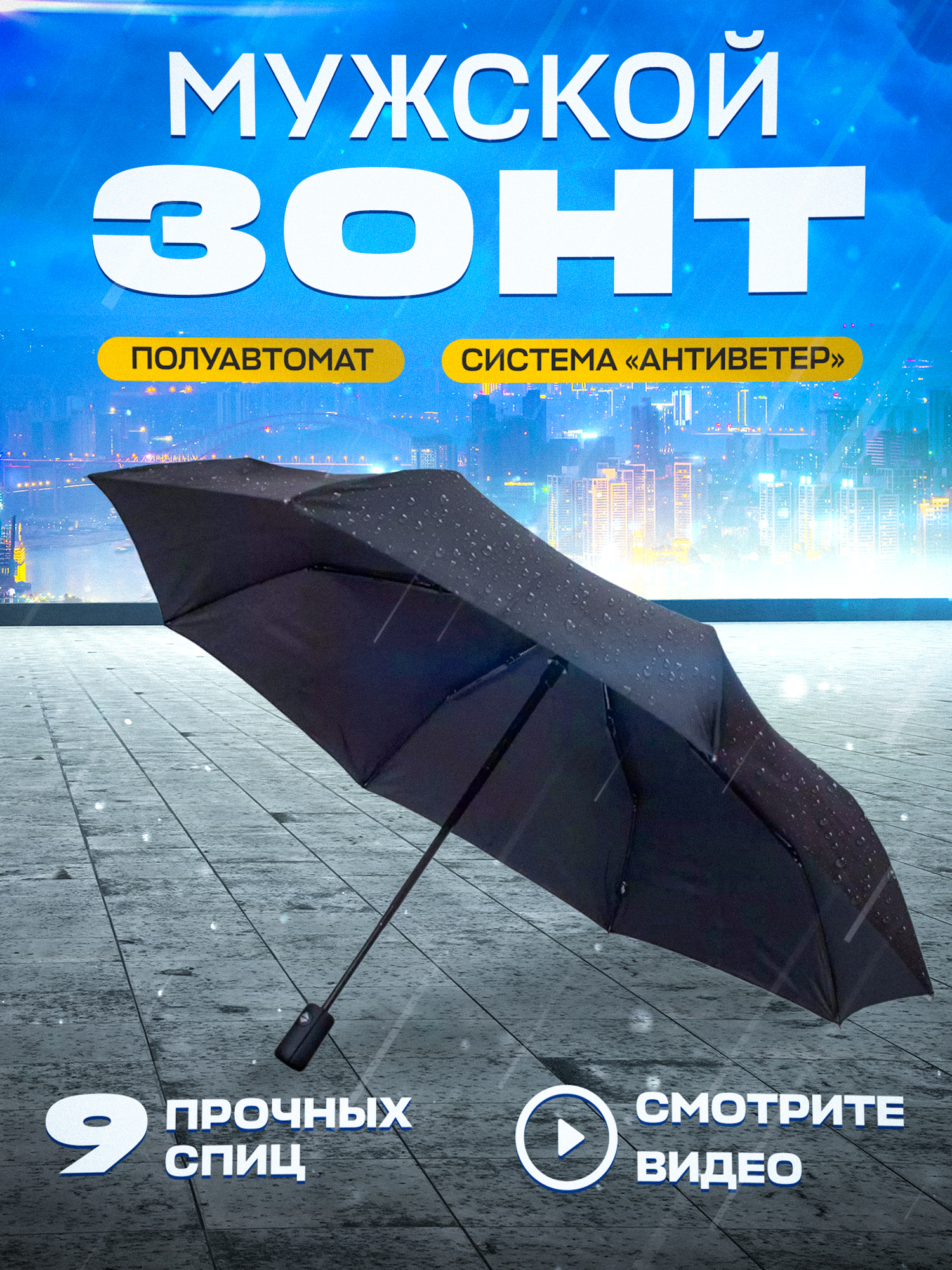 Зонт мужской полуавтомат черный / складной / большой купол - 102 см/ 3 сложения / 9 спиц / от солнца от дождя