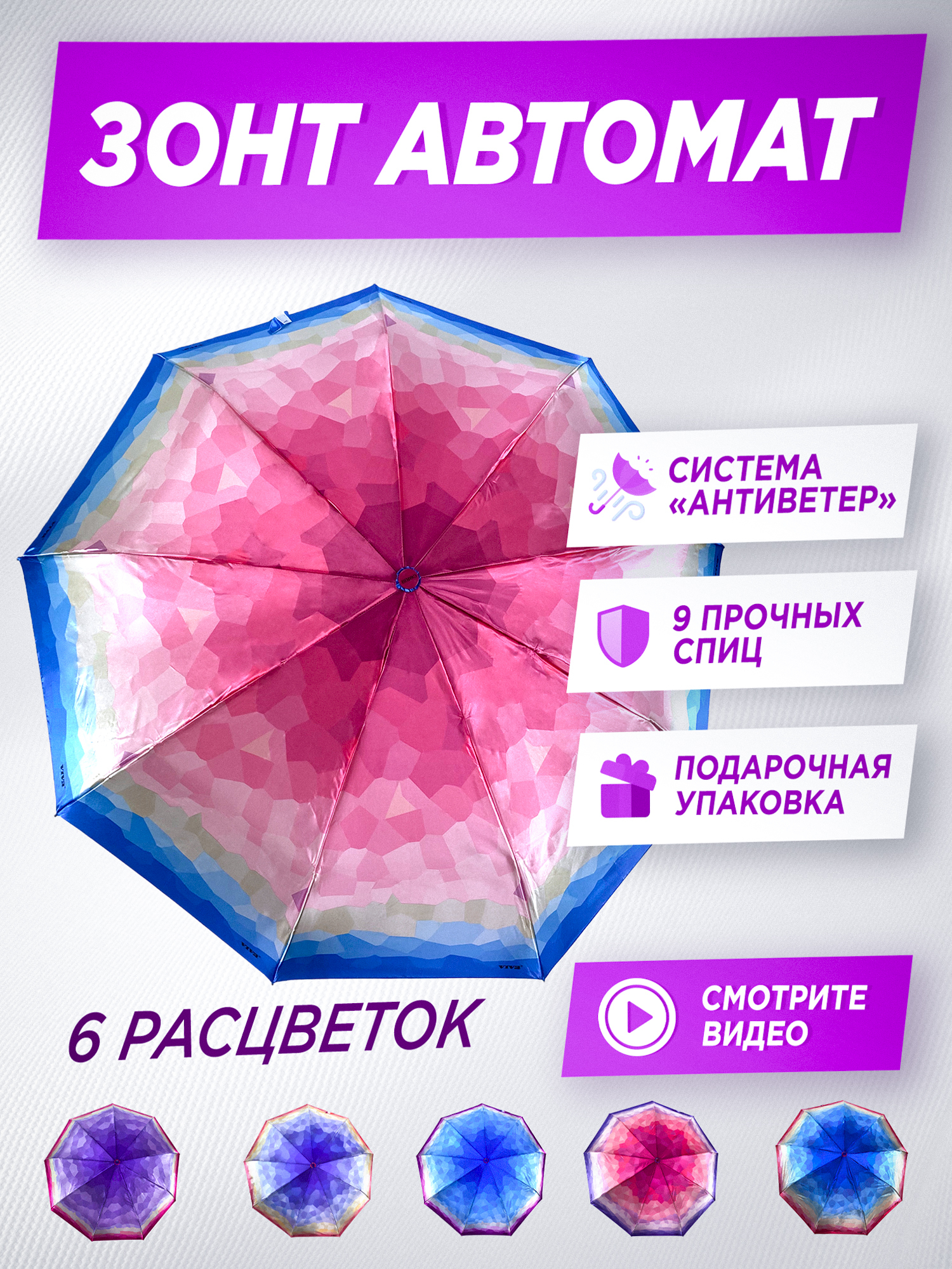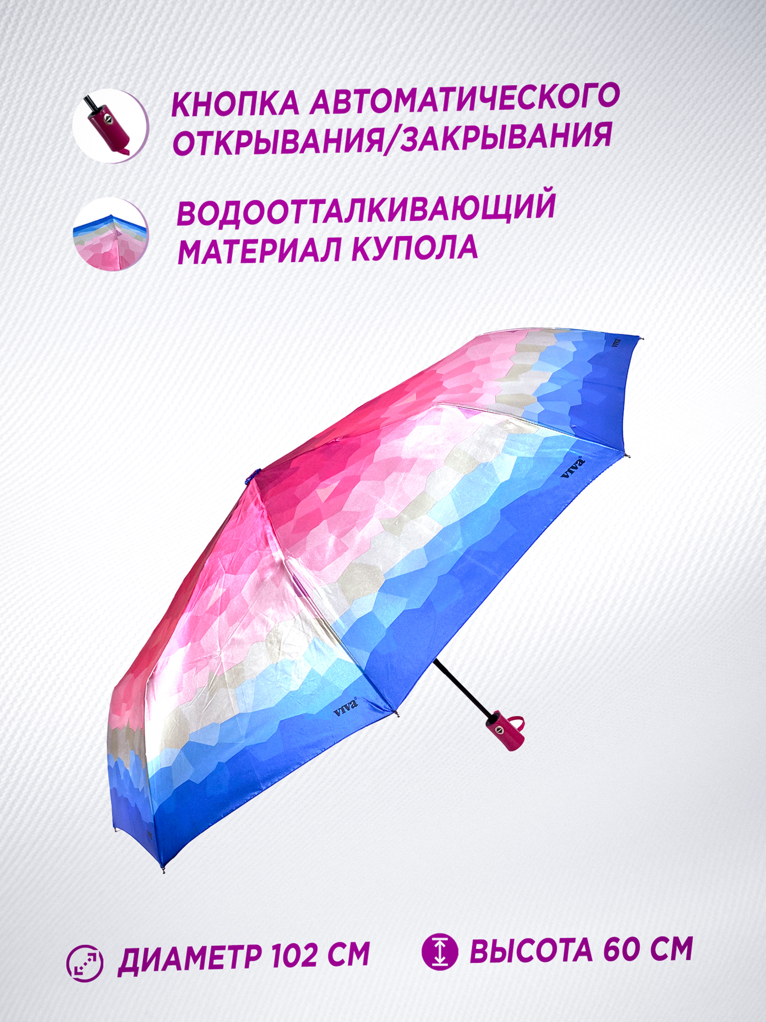 Зонт женский автомат / складной / яркий / купол - 102 см/ 3 сложения / 9 спиц / от солнца от дождя