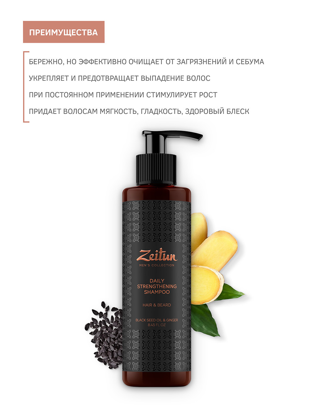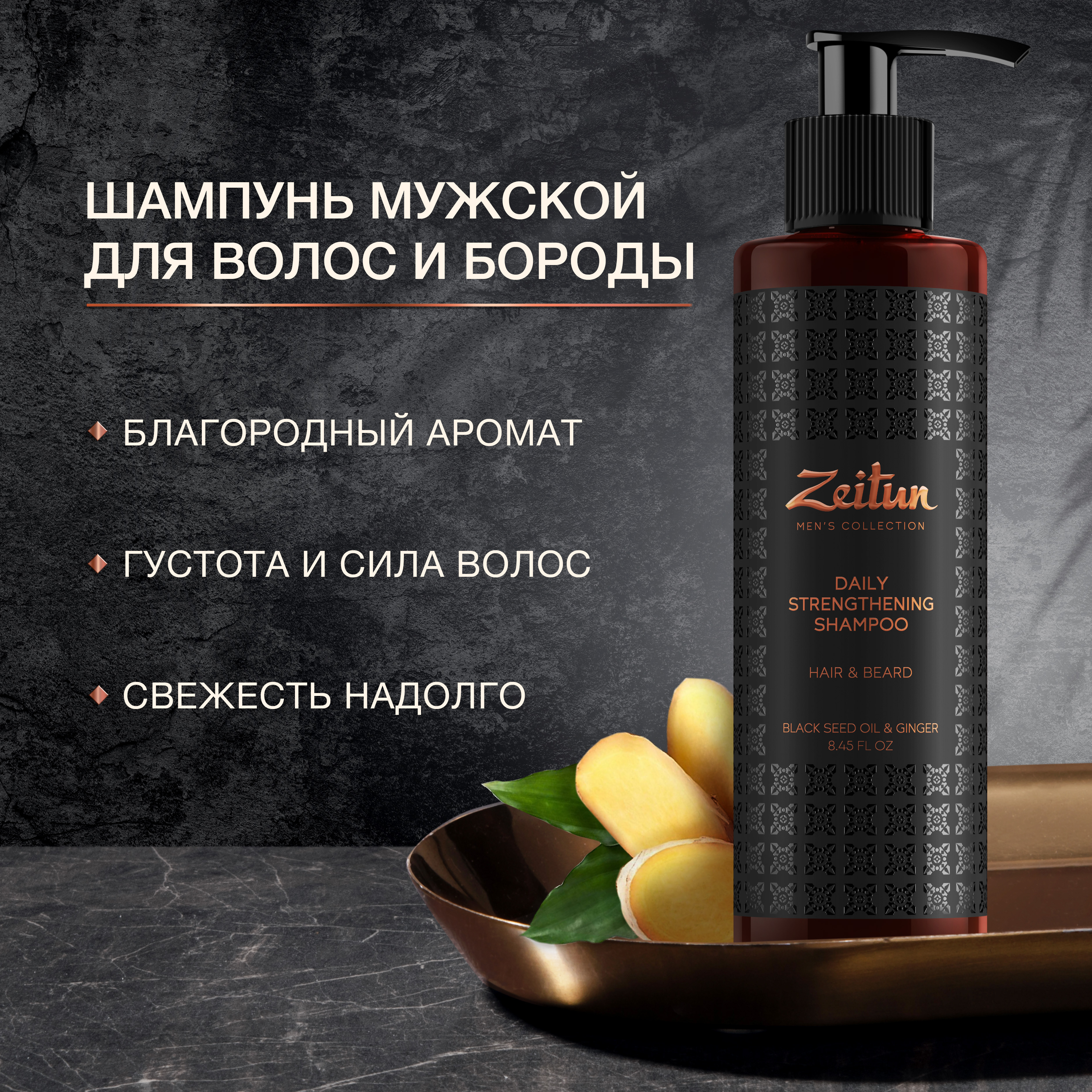 Zeitun Укрепляющий стимулирующий шампунь для волос и бороды с имбирем и черным тмином для мужчин
