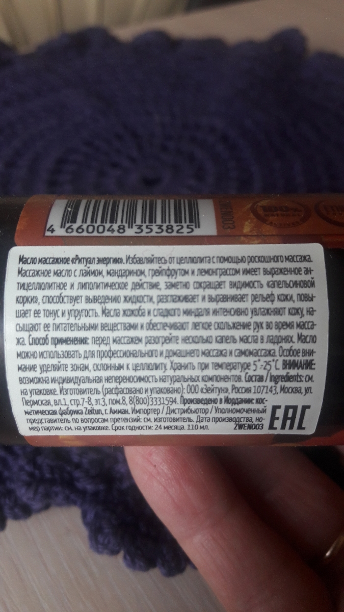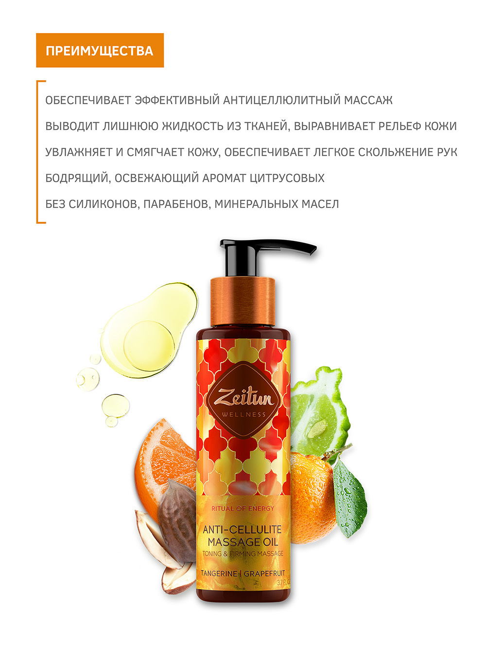 Zeitun Масло массажное "Ритуал энергии" антицеллюлитное c эфирными маслами мандарина и грейпфрута, 110 мл