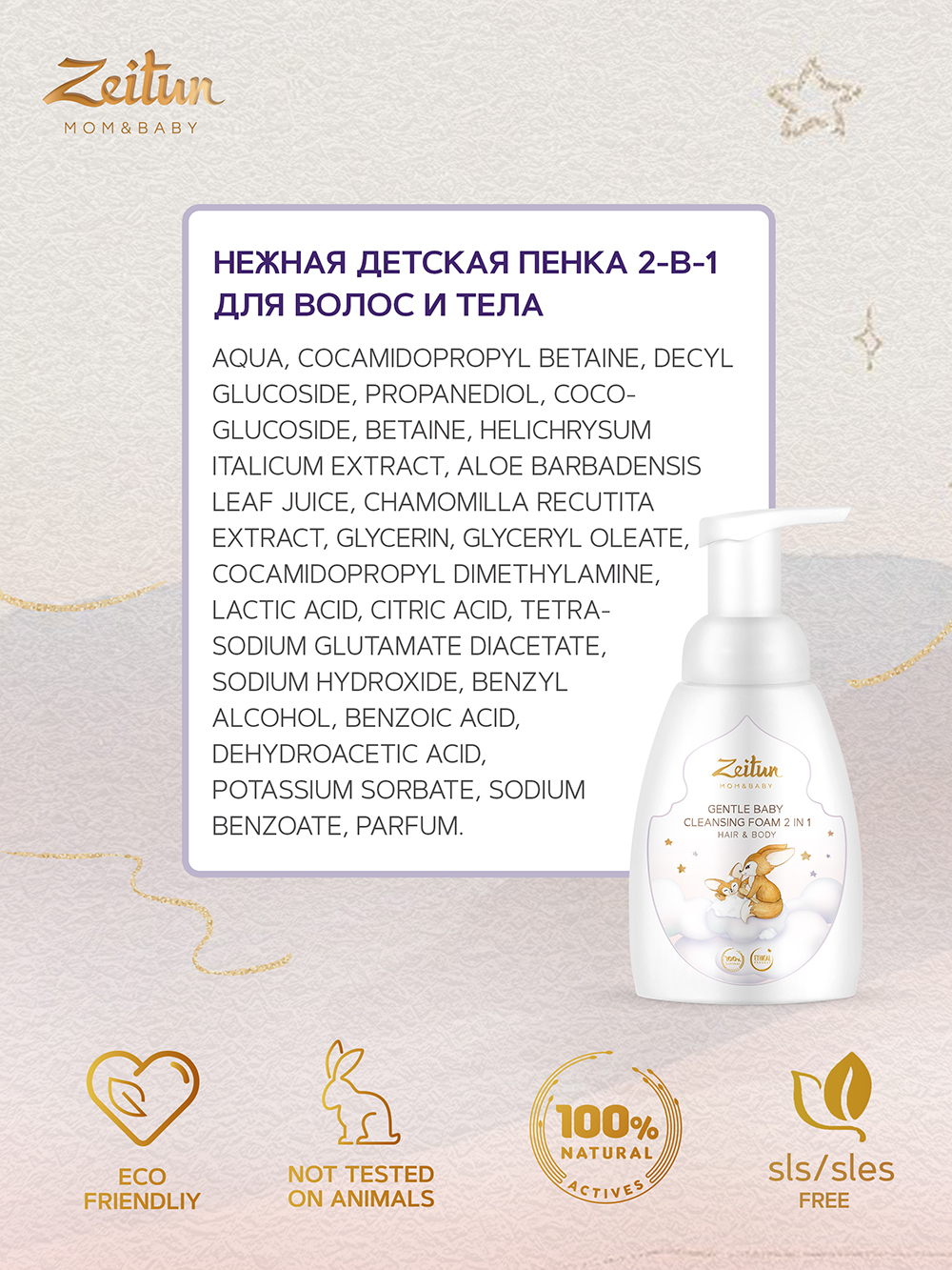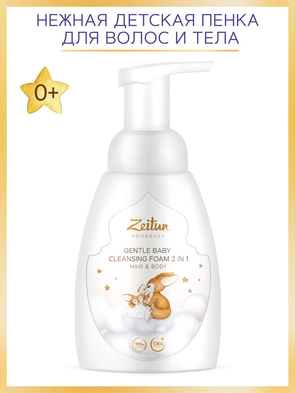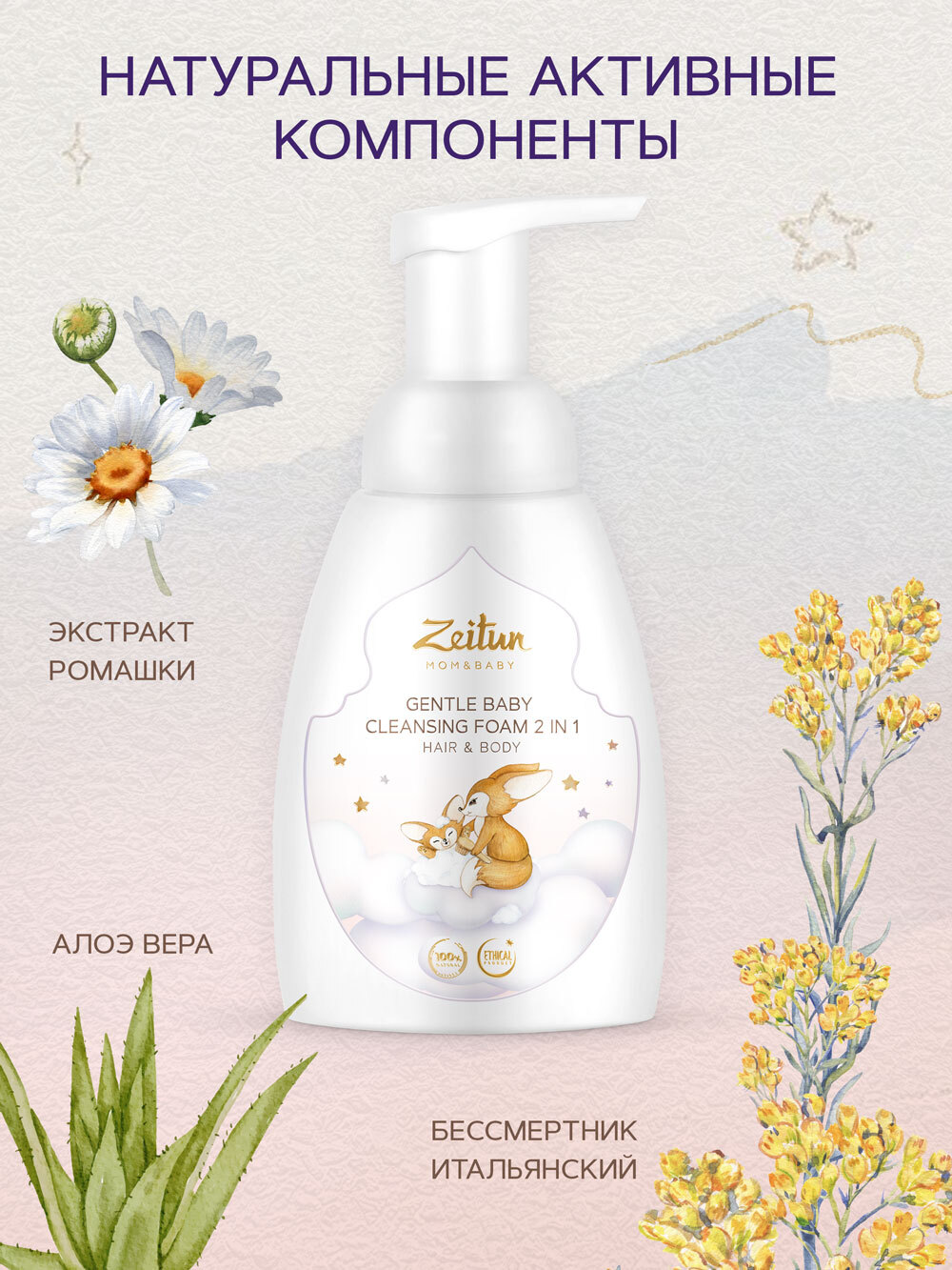 Zeitun Нежная детская пенка 2в1: для очищения волос и тела 0+, с алоэ вера и ромашкой, нейтральный PH,250мл