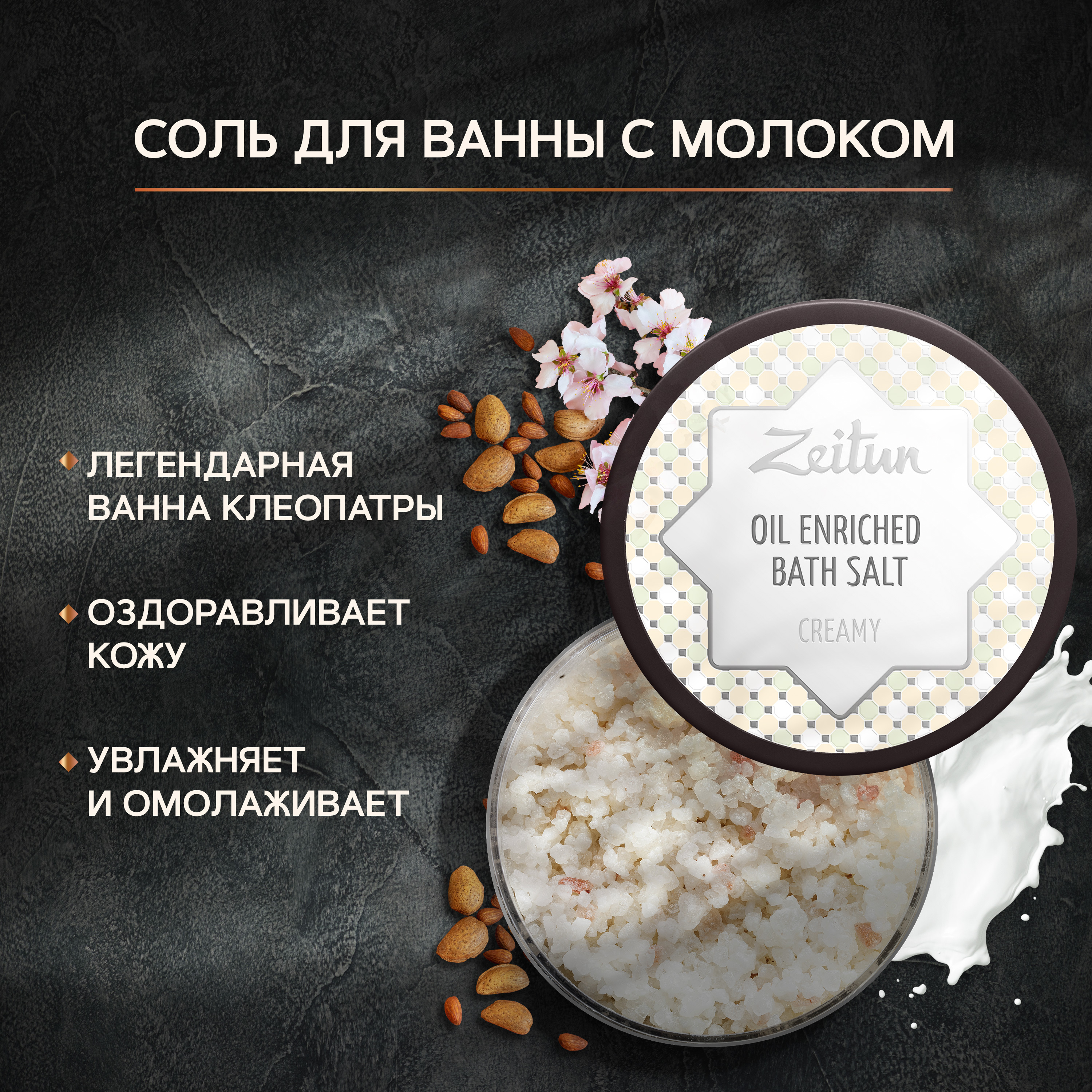 Zeitun Соль для ванны "Сливочная" ароматизированная с маслом миндаля и козьим молоком, натуральная соль с эфирными маслами, соль для ванны морская, 250 мл