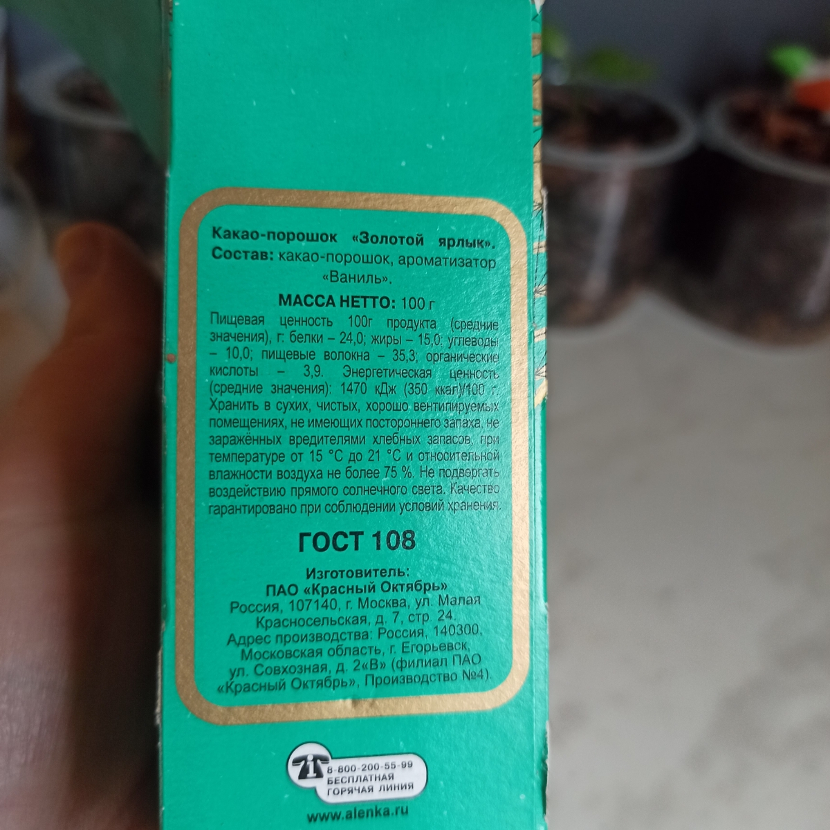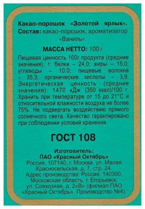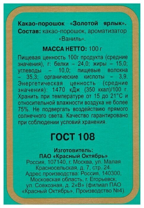 Какао-порошок Золотой Ярлык 100 гр., ГОСТ 108