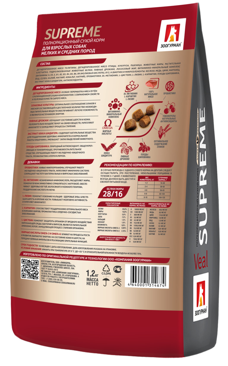 Полнорационный сухой корм для собак мелких и средних пород Zoogurman Телятина 1,2 кг