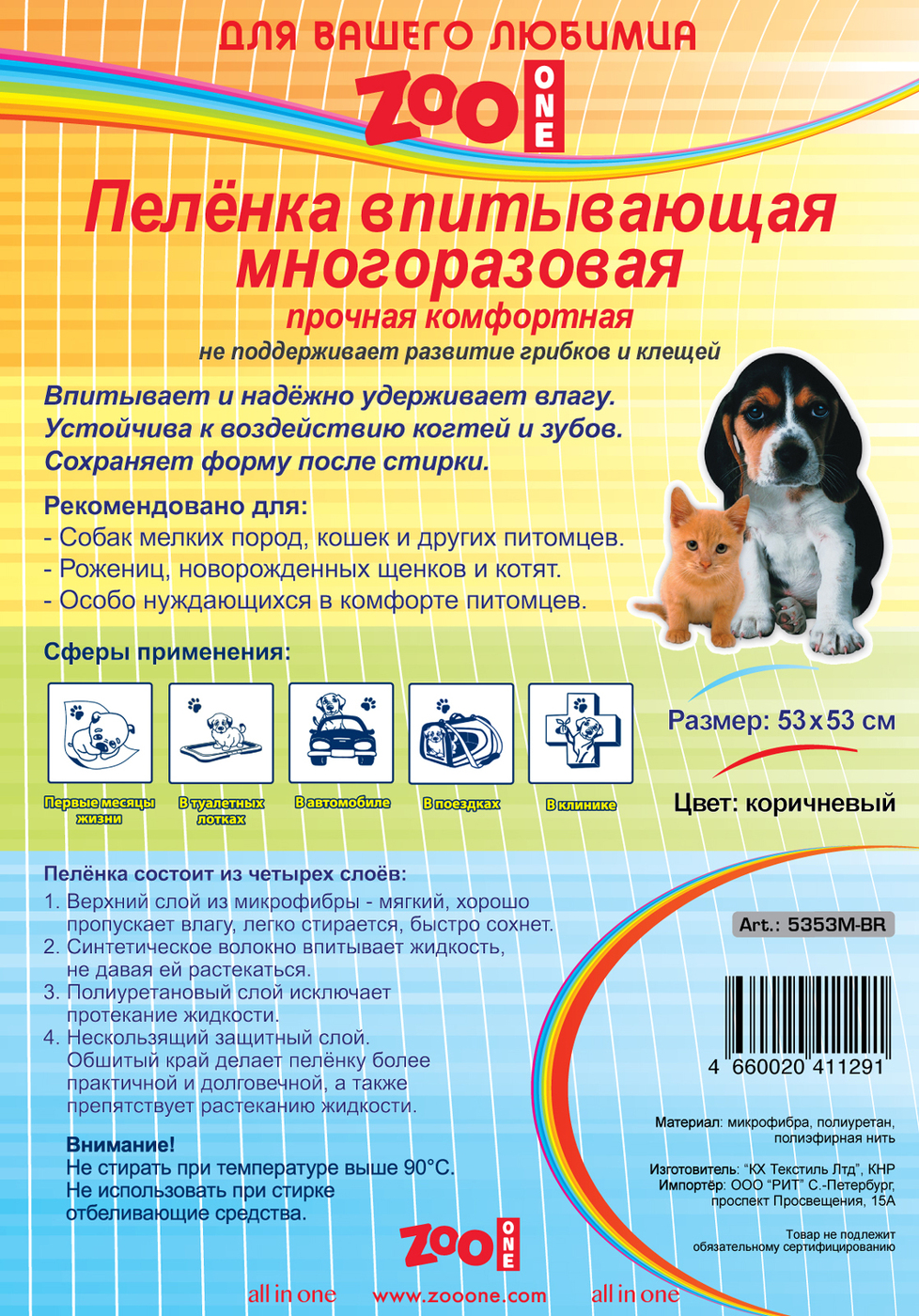 Пелёнка впитывающая многоразовая Zoo One, 53 х 53 см, коричневая, 5353M-BR