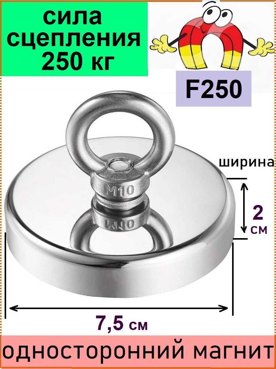 Поисковый магнит односторонний 250 кг, F250, неодимовый, размер 7,5 х 2 см