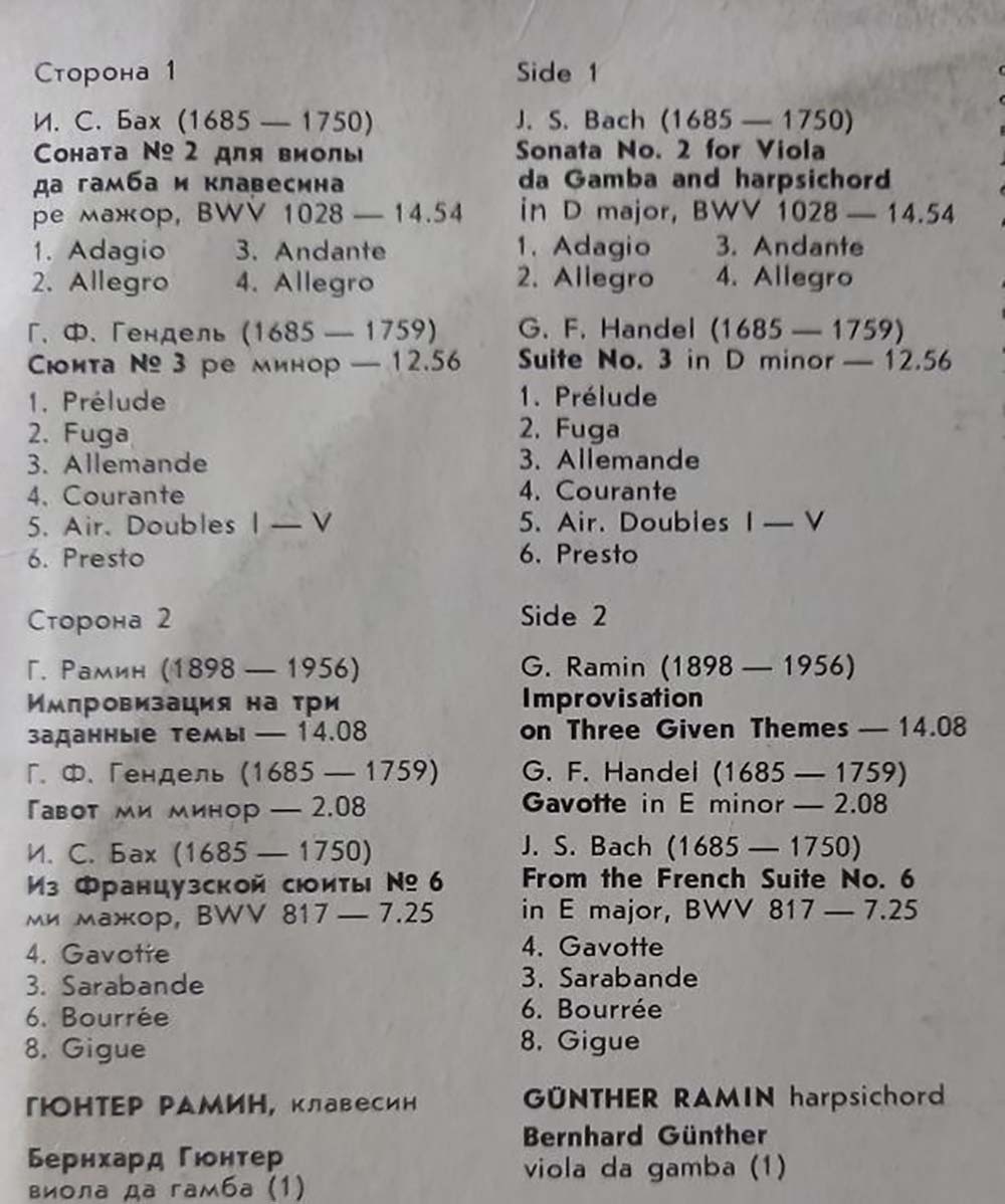 Пластинка виниловая "Г. Рамин, И. Бах, Г. Гендель. На концертах выдающихся мастеров" 300 мм.