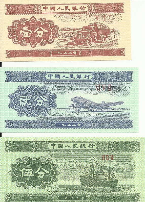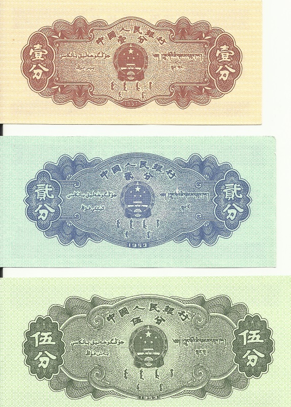 Комплект банкнот номиналом 1, 2, 5 фэней. Китай. 1953 год