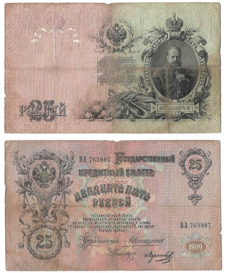 Банкнота 25 рублей 1909 года, Царская Россия, Российская Империя, Государственный Кредитный Билет