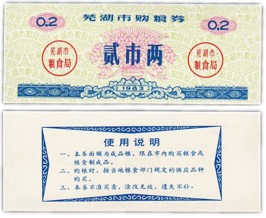 Китай продовольственный талон 0,2 единицы 1983 год Рисовые деньги