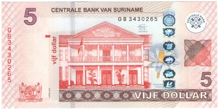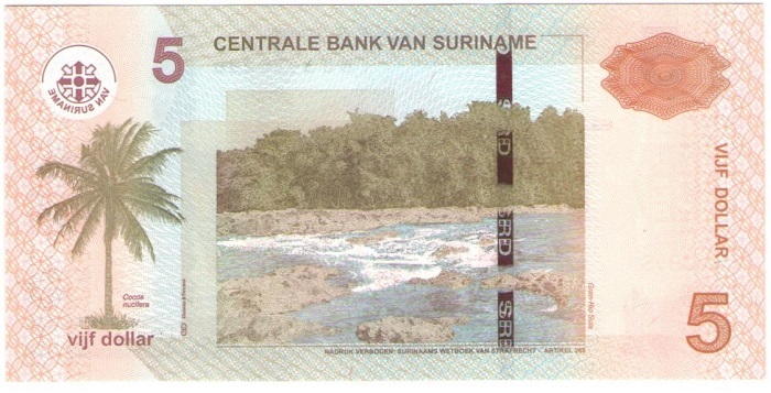 Банкнота номиналом 5 долларов 2012 года. Суринам