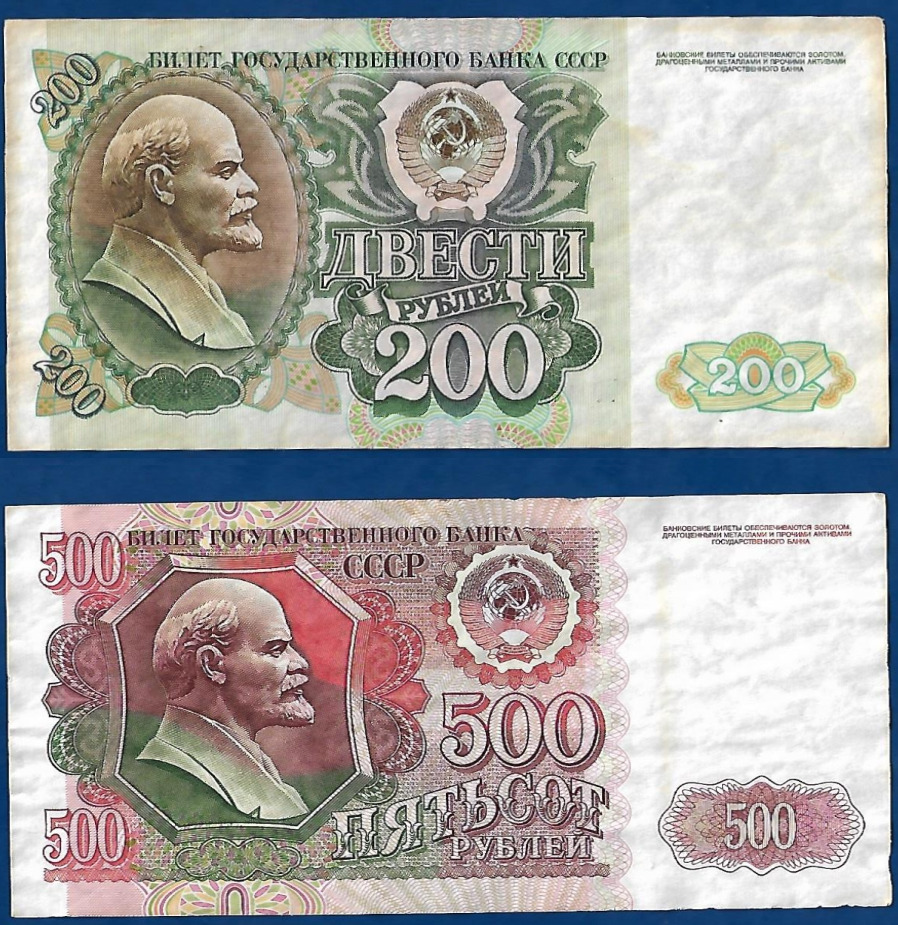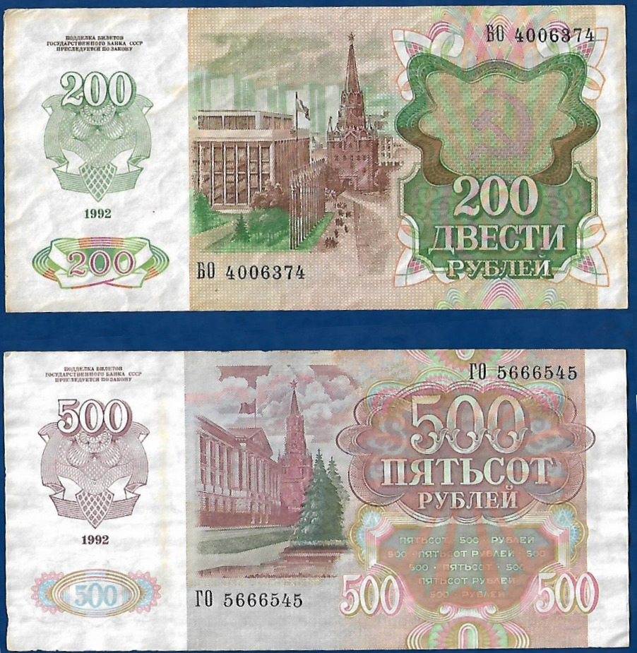 Набор из двух подлинных банкнот 500 и 200 рублей 1992 год СССР бона/купюра/банкнота
