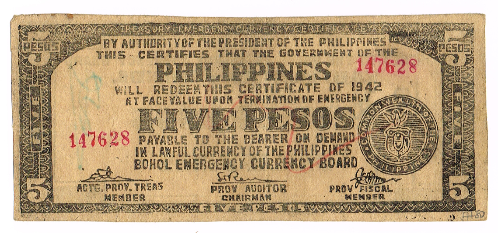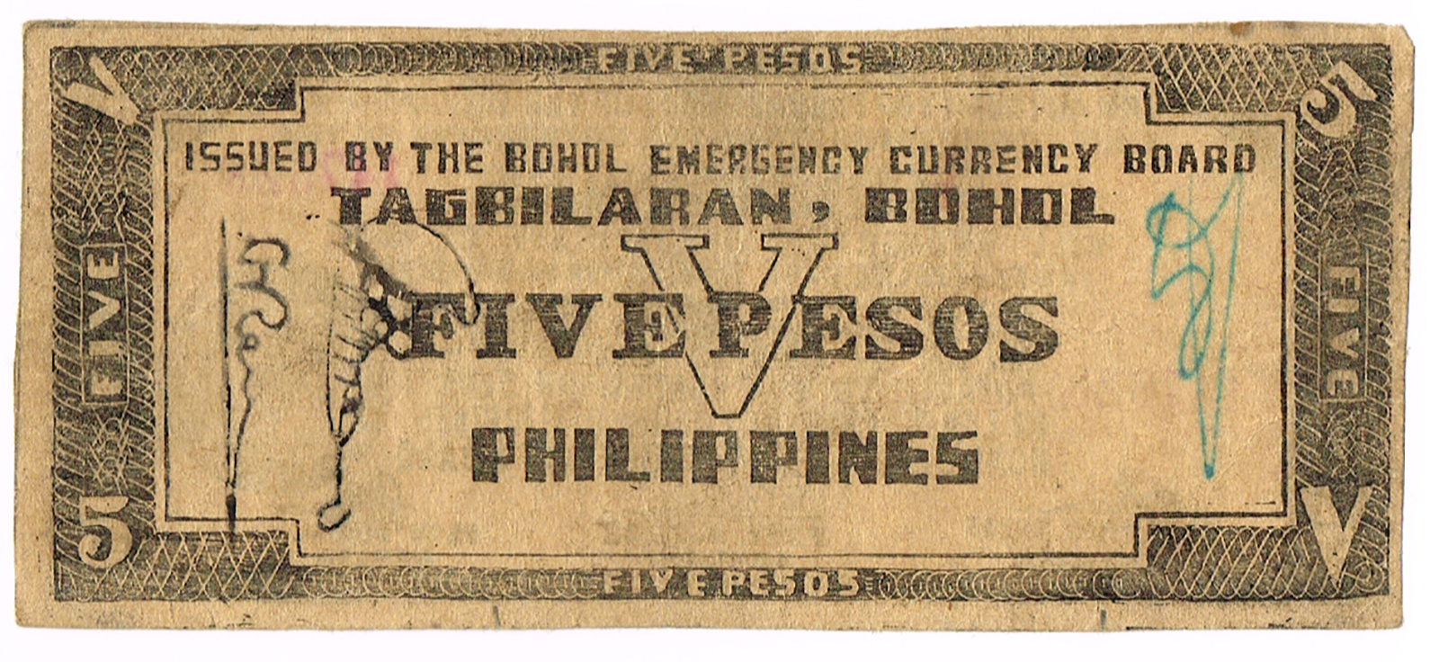 Банкнота 5 песо 1942 года. 147628 Остров Бохол. Денежный знак чрезвычайных обстоятельств. Партизаны. 2-я мировая война. Филиппины AU