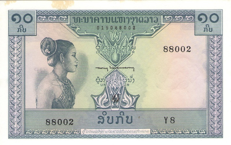 Банкнота номиналом 10 кипов. Лаос. 1962 год, XF