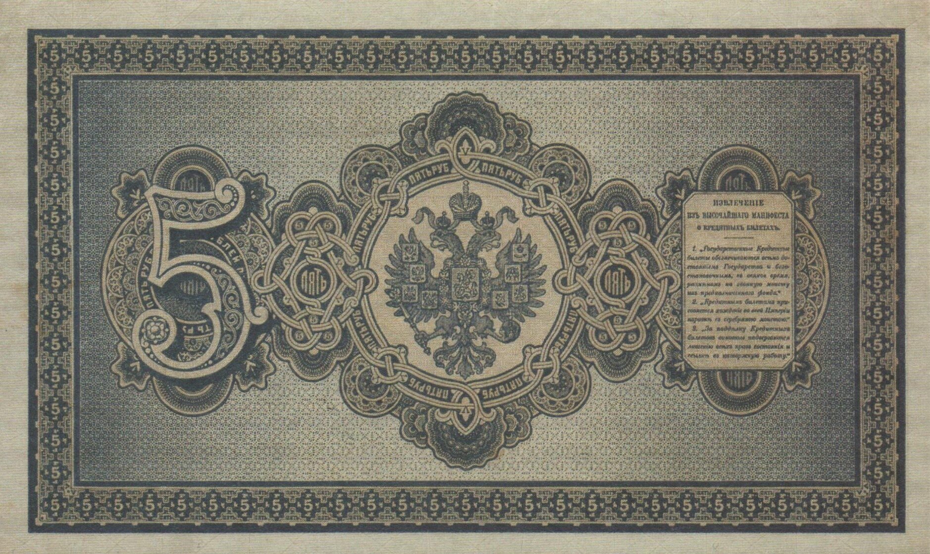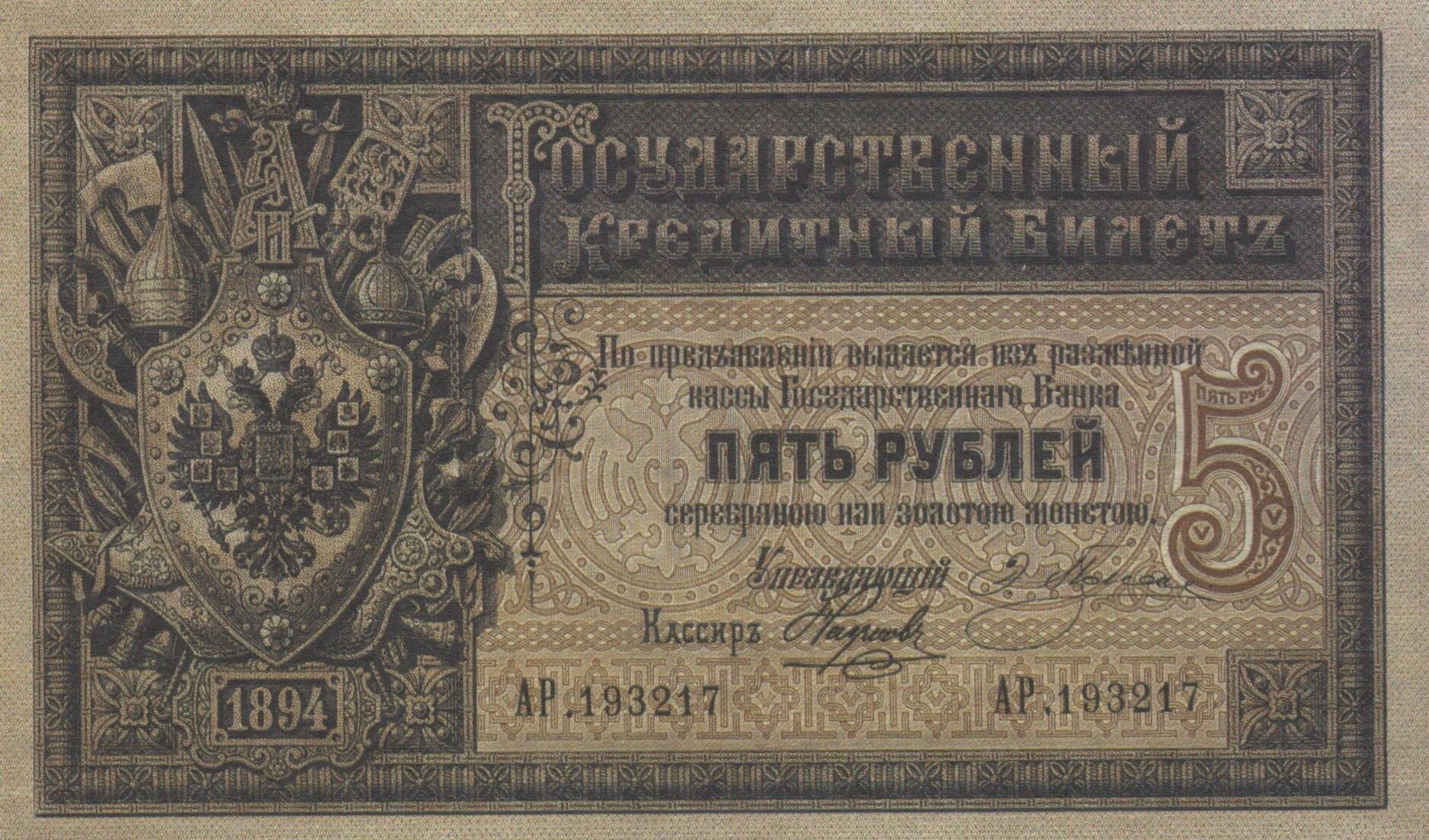 Банкнота 5 рублей 1894 года Плеске Наумов Россия Копия