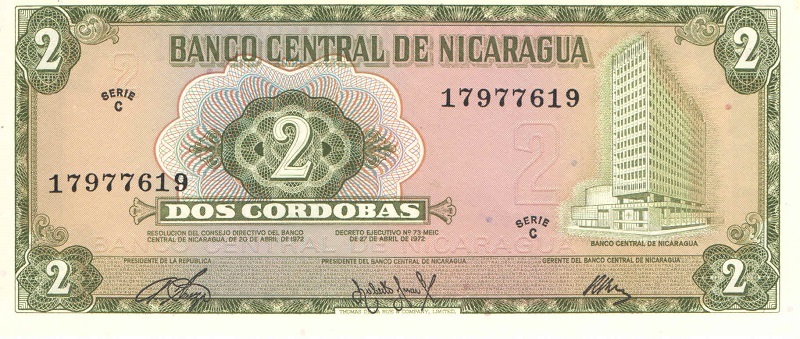 Банкнота номиналом 2 кордоба. Никарагуа. 1972 год