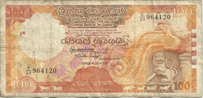 Банкнота номиналом 100 рупий. Шри-Ланка. 1988 год