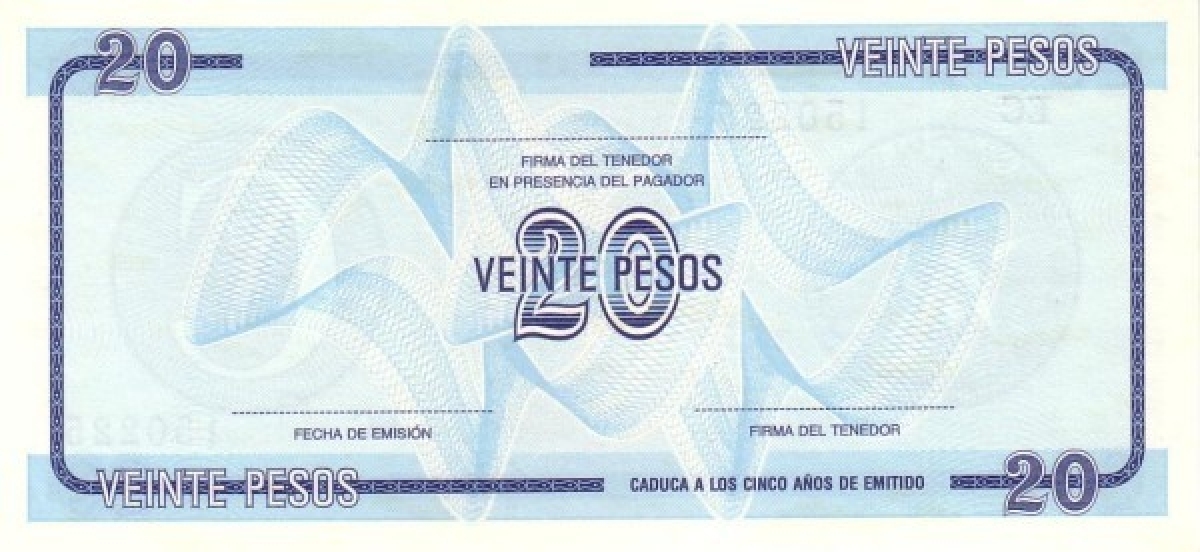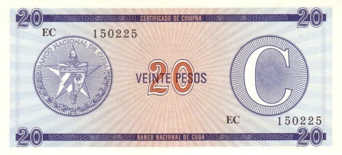 Куба 20 песо 1985 г Валютный сертификат. Серия # С UNC Узкая С