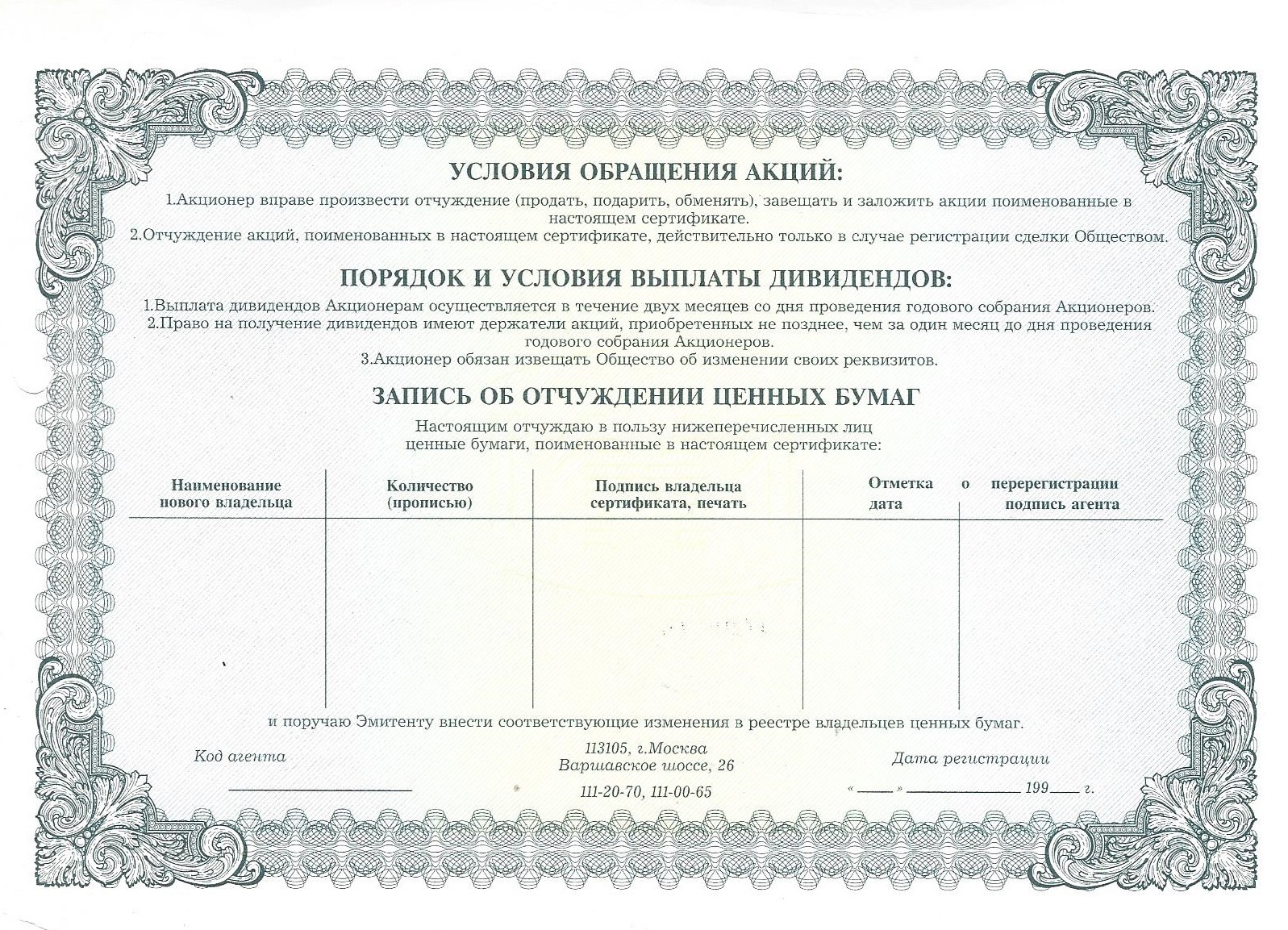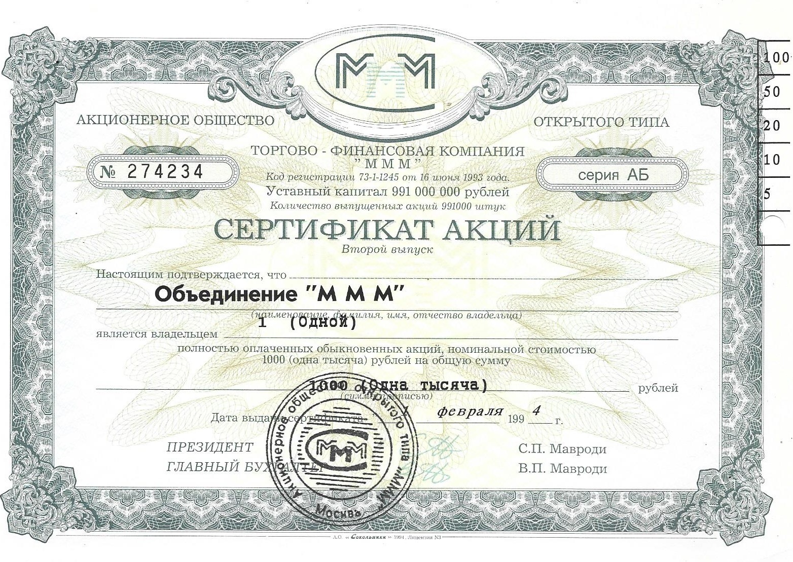 Сертификат на 1 акцию МММ серия АБ 1994 год