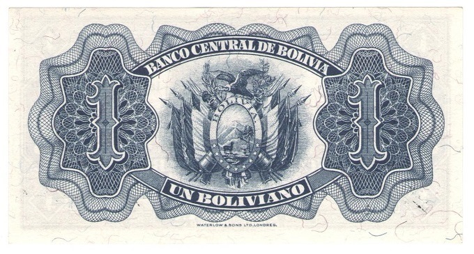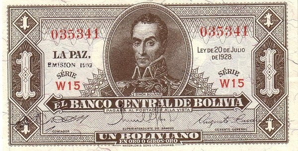 Банкнота номиналом 1 боливиано 1952 года. Боливия
