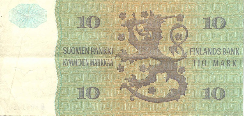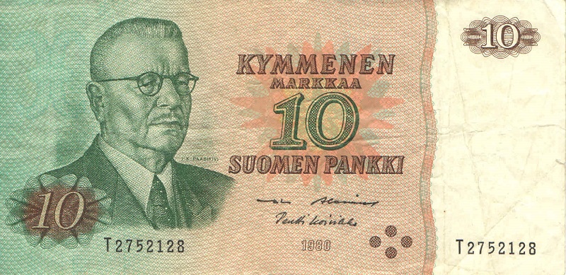 Банкнота номиналом 10 марок. Финляндия. 1980 год