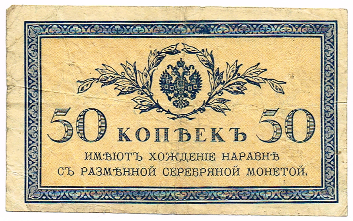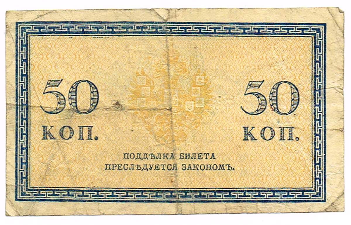 Банкнота 50 копеек 1915 года. Казначейский разменный знак Российской Империи VF - 7