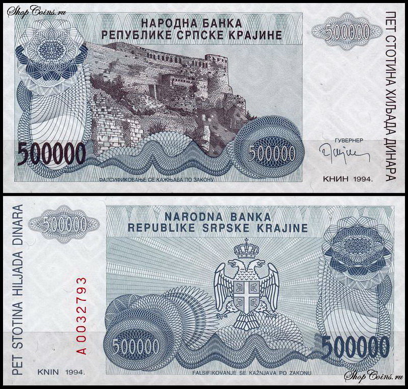 Хорватия 500 000 динар 1994 (UNC Pick R32) Сербская Краина
