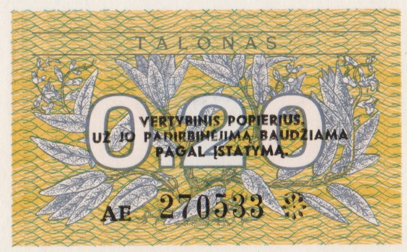 Банкнота номиналом 0,20 талона. Литва. 1991 год