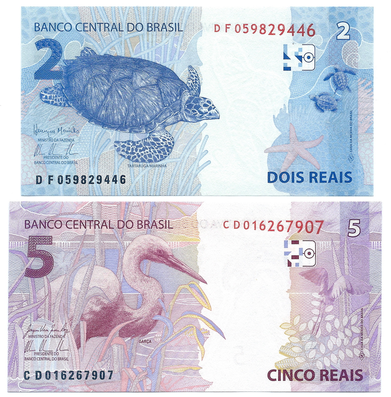 Набор из 2 банкнот "Фауна Бразилии: Морская черепаха, Большая белая цапля"