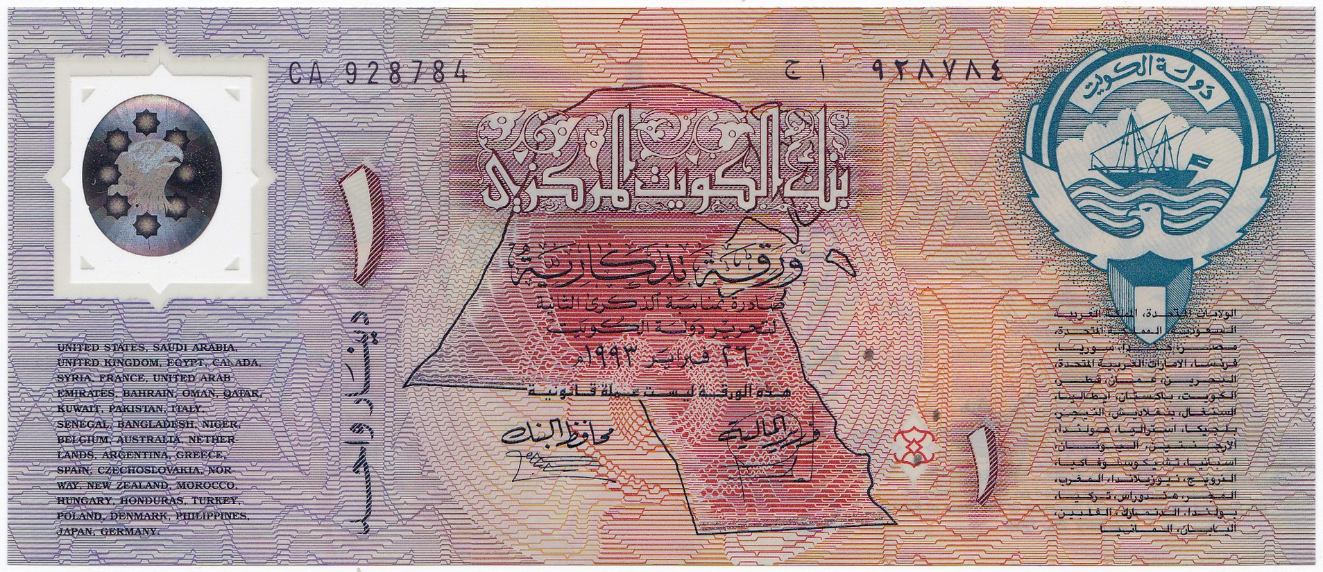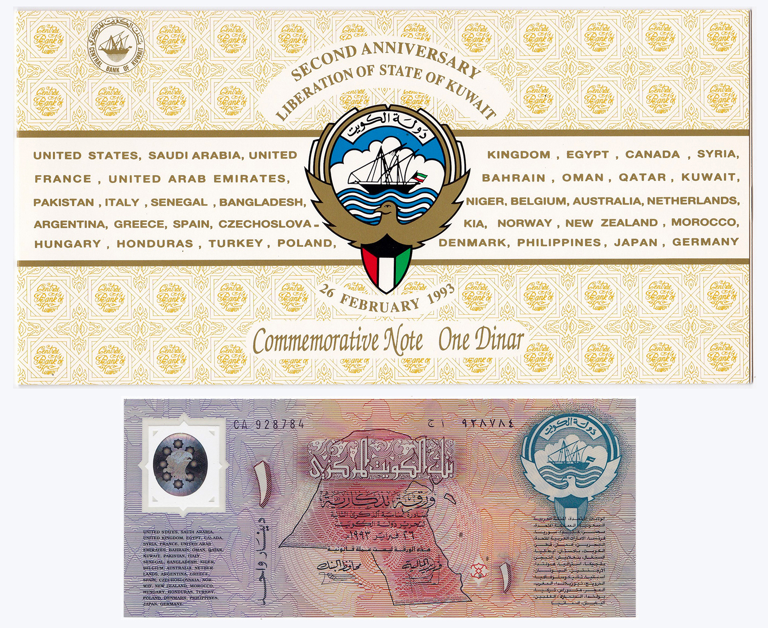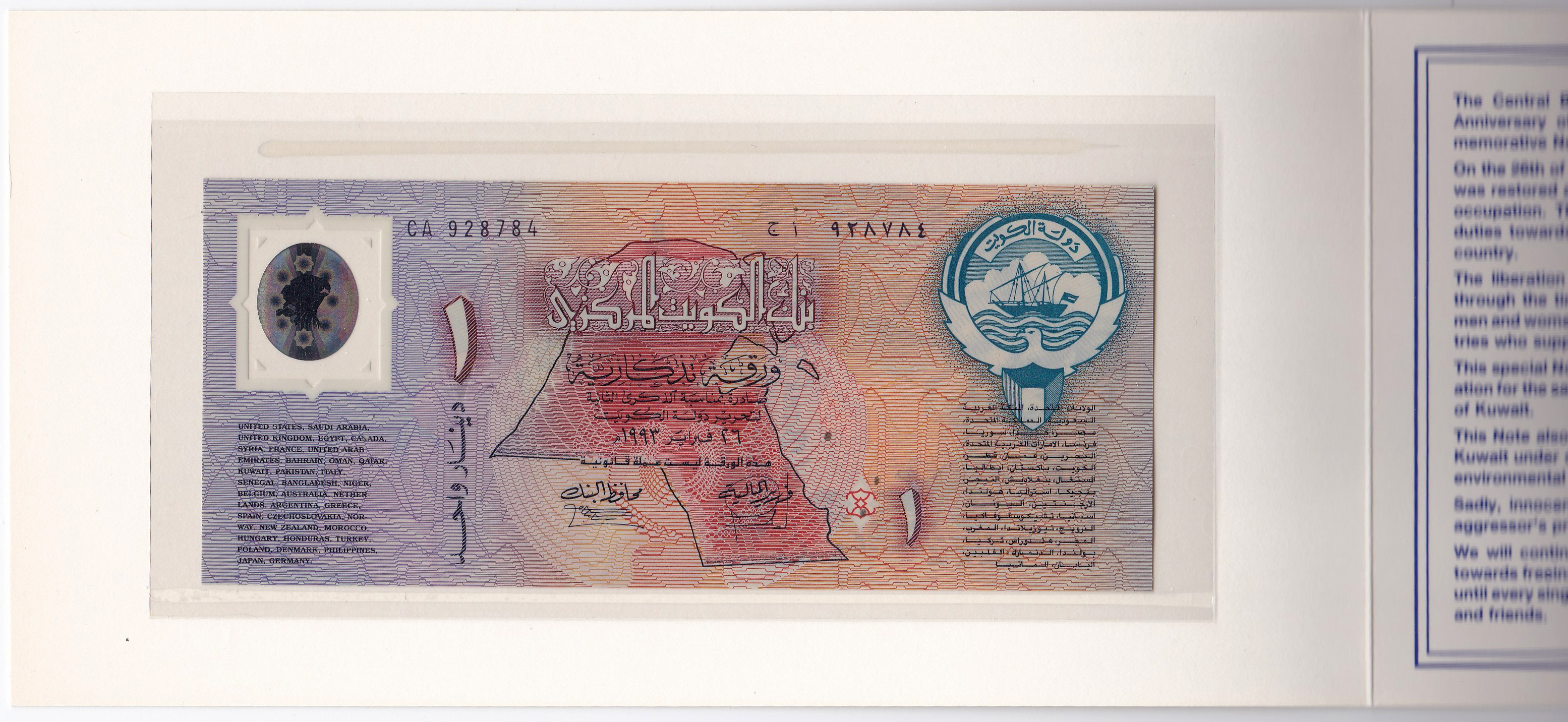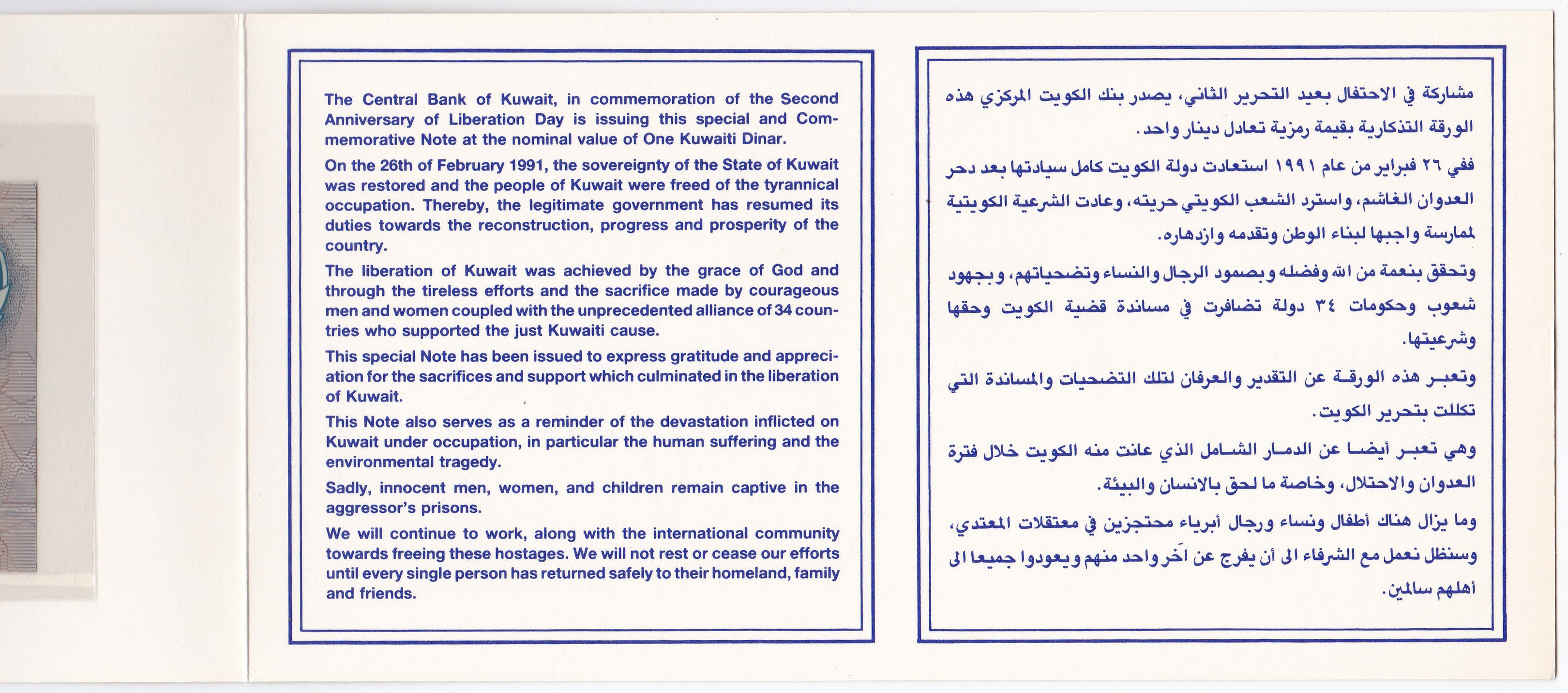 Кувейт, 1 динар 1993, P-CS1, UNC, Памятные, в буклете, 2-ая годовщина независимости