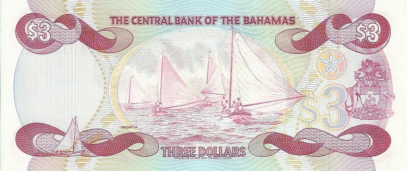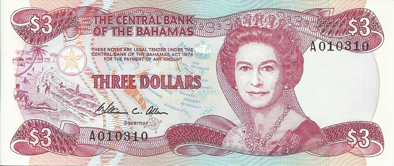 Банкнота номиналом 3 доллара. Багамские острова. 1984 год