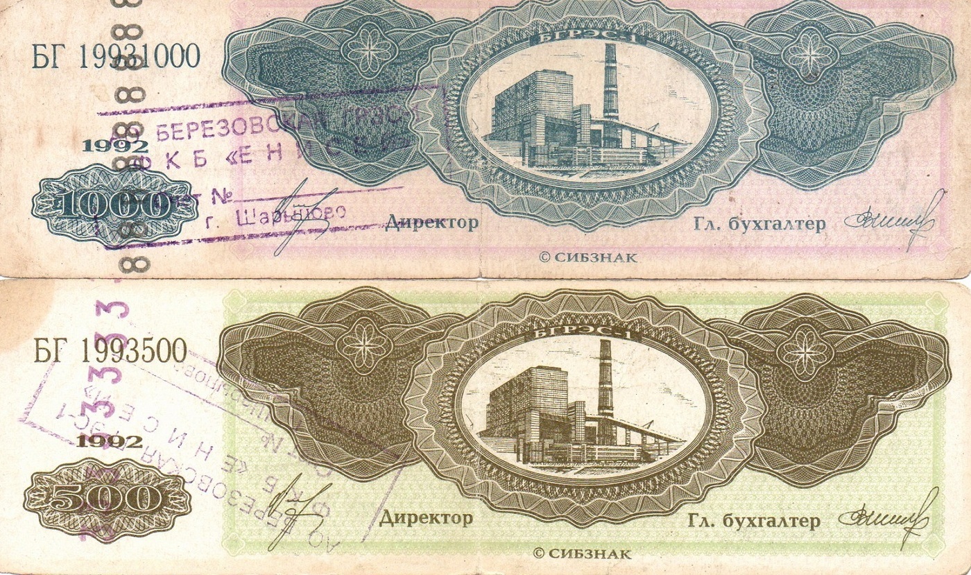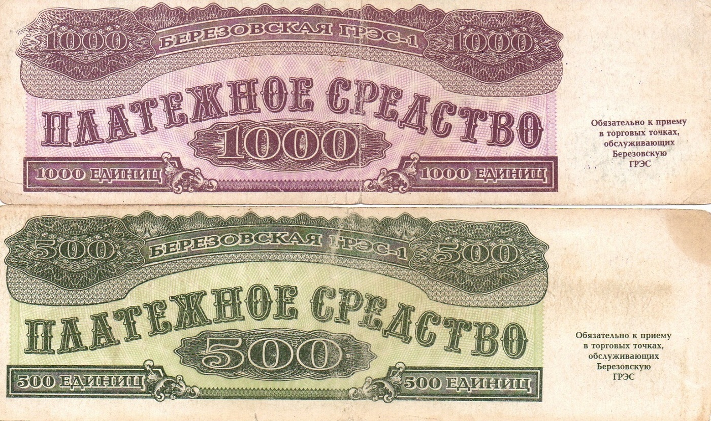 Банкноты 500 и 1000 "Платежное средство Березовская ГРЭС-1"