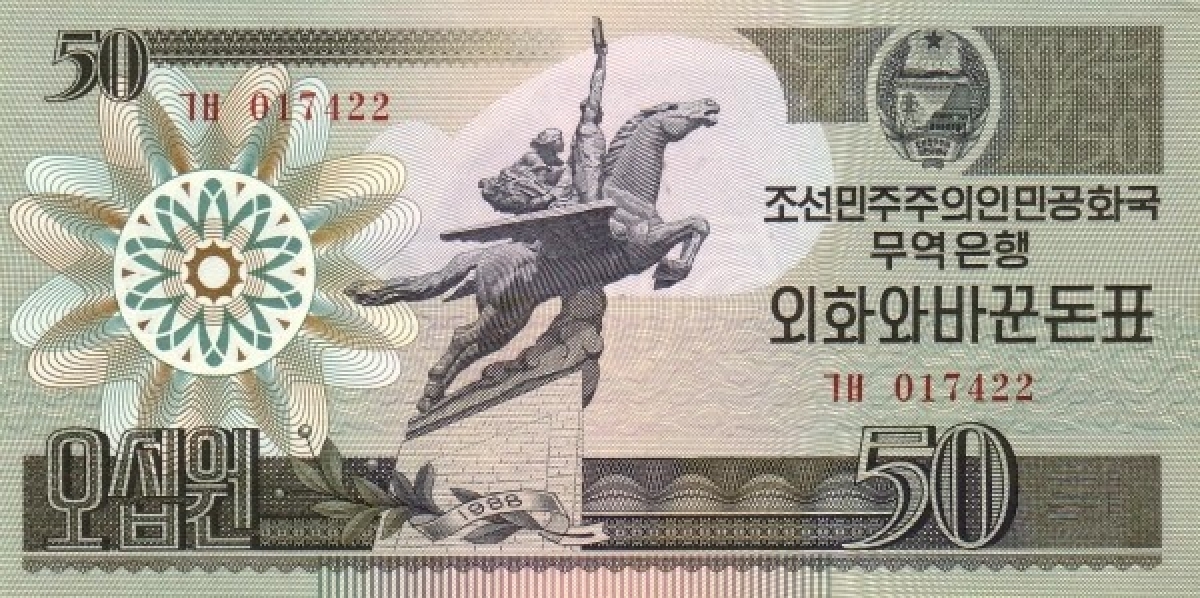 Северная Корея 50 вон 1988 г Мифический крылатый конь Чхоллима UNC