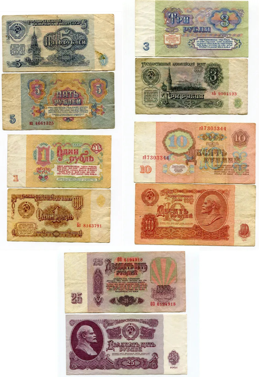 Набор из банкнот 1, 3, 5, 10 и 25 рублей образца 1961 года СССР